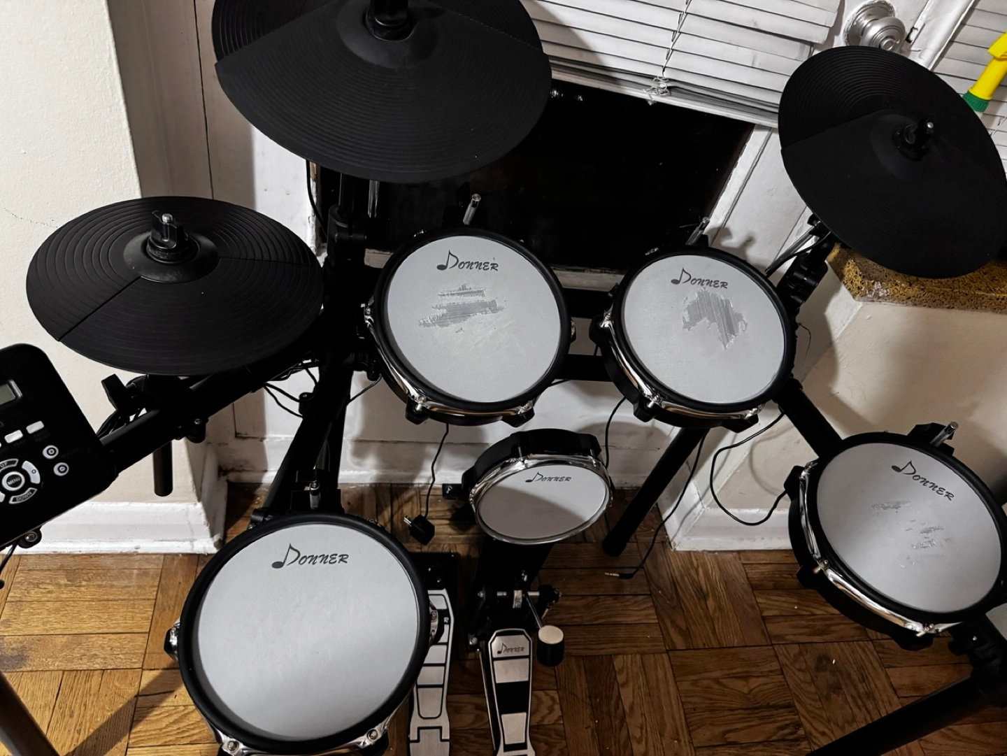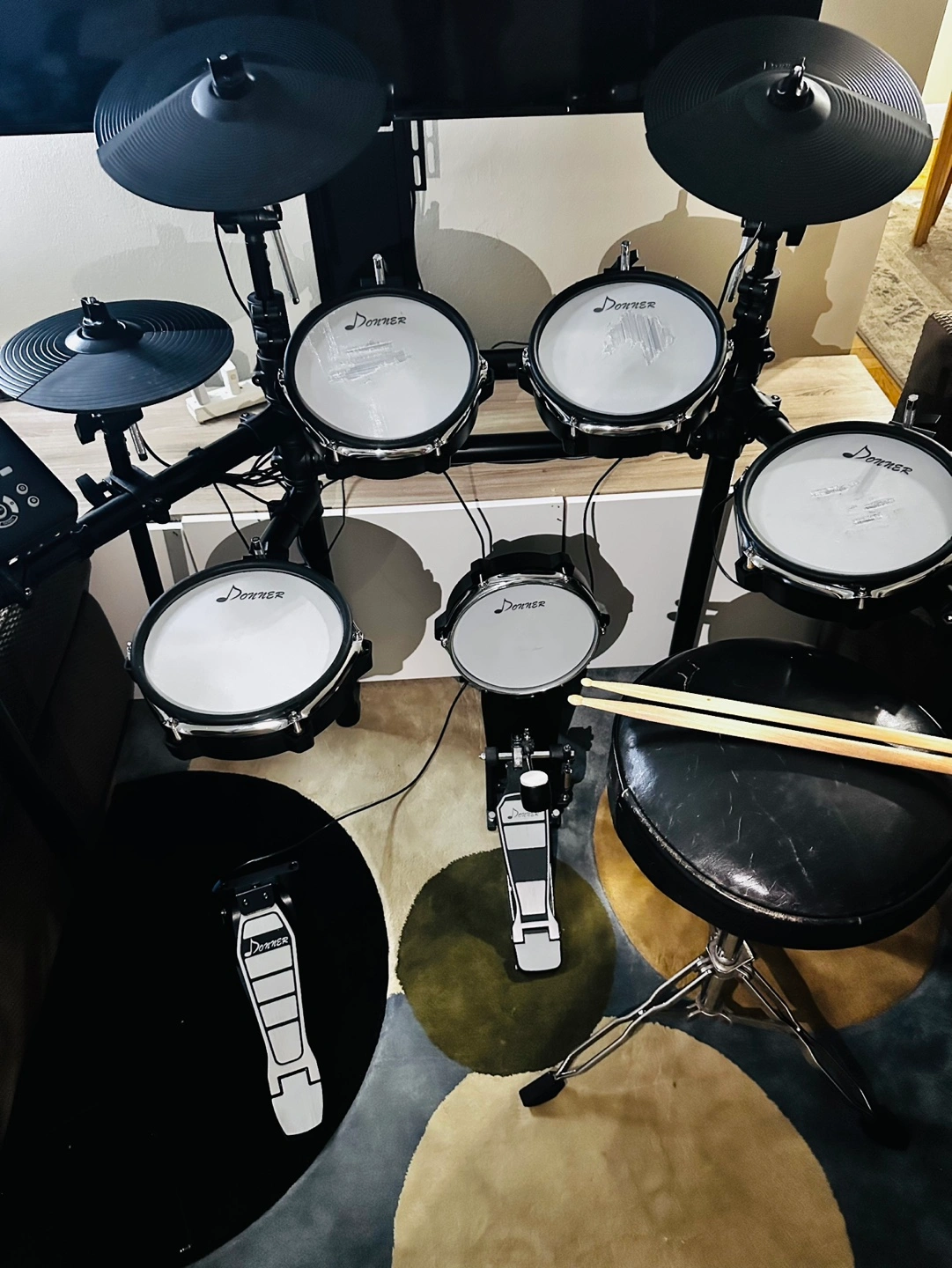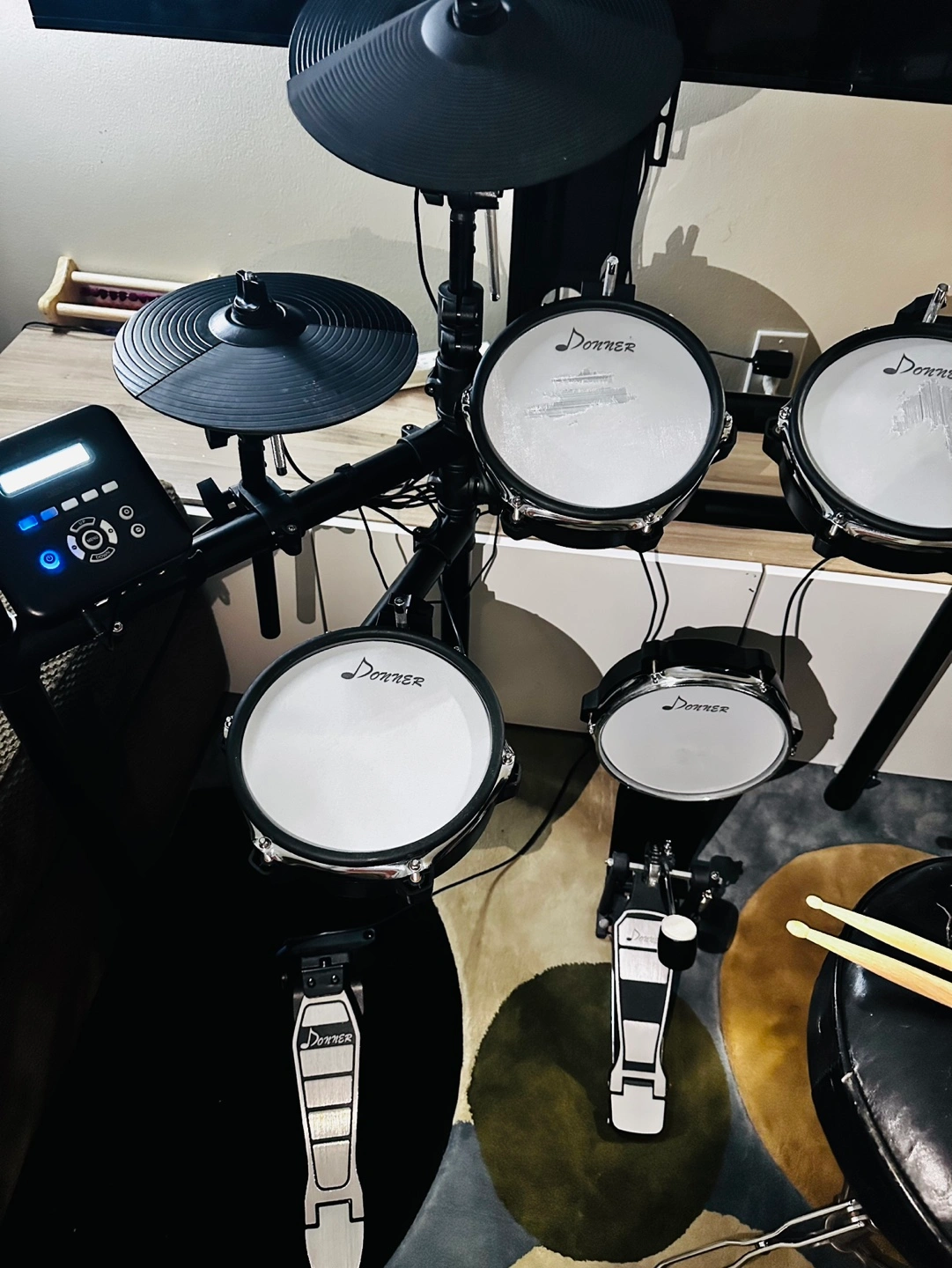 Complete electronic drum kit. Includes all drums, cymbals, pedals, and a drum stool. Drumsticks also included. Great for practice or beginners.