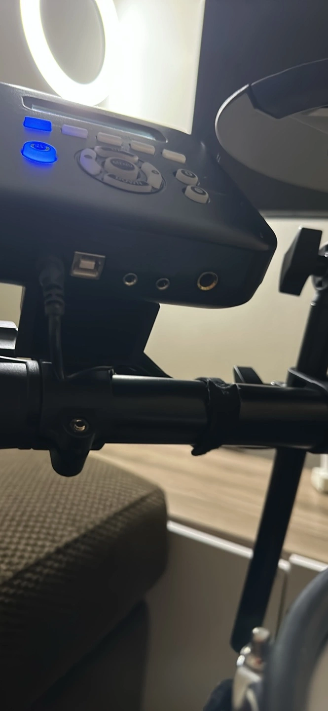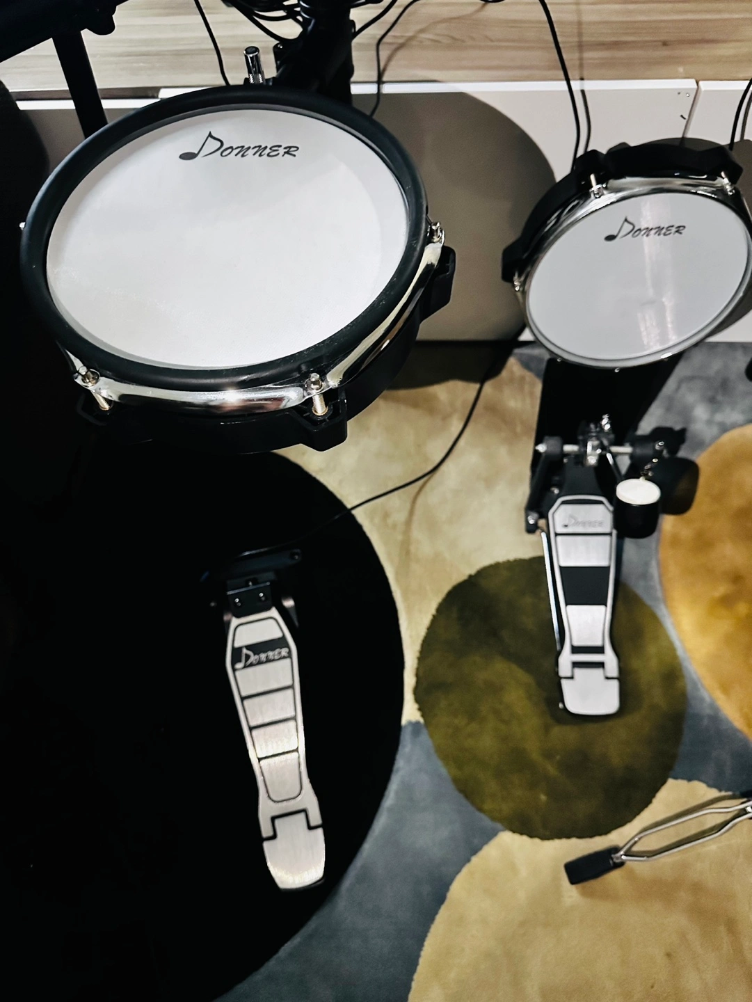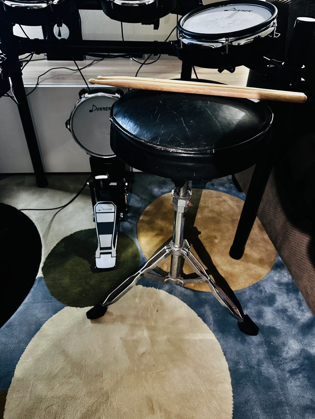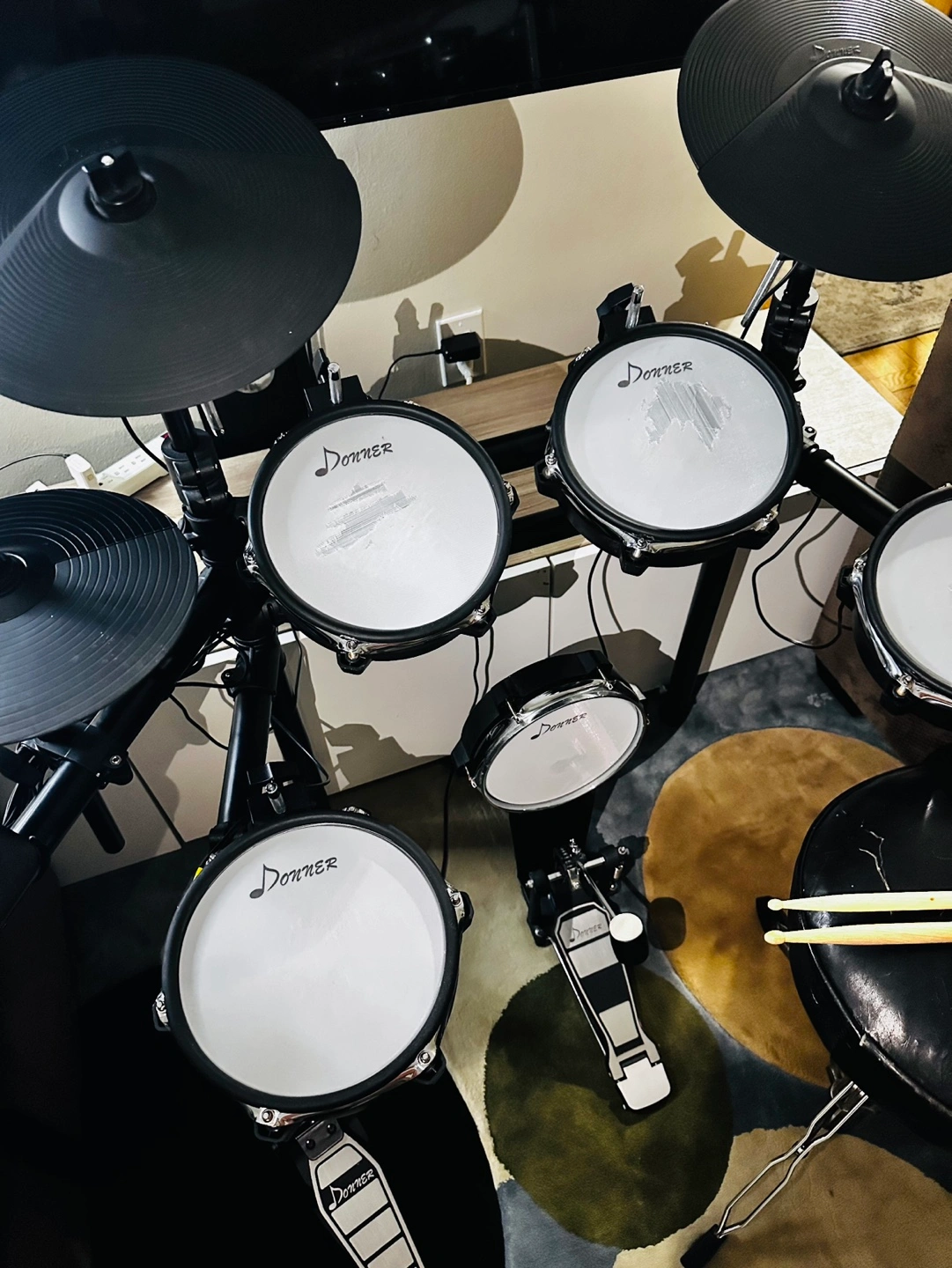 Complete electronic drum kit. Includes all drums, cymbals, pedals, and a drum stool. Drumsticks also included. Great for practice or beginners.