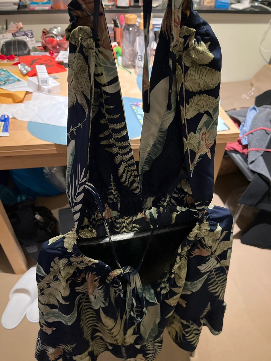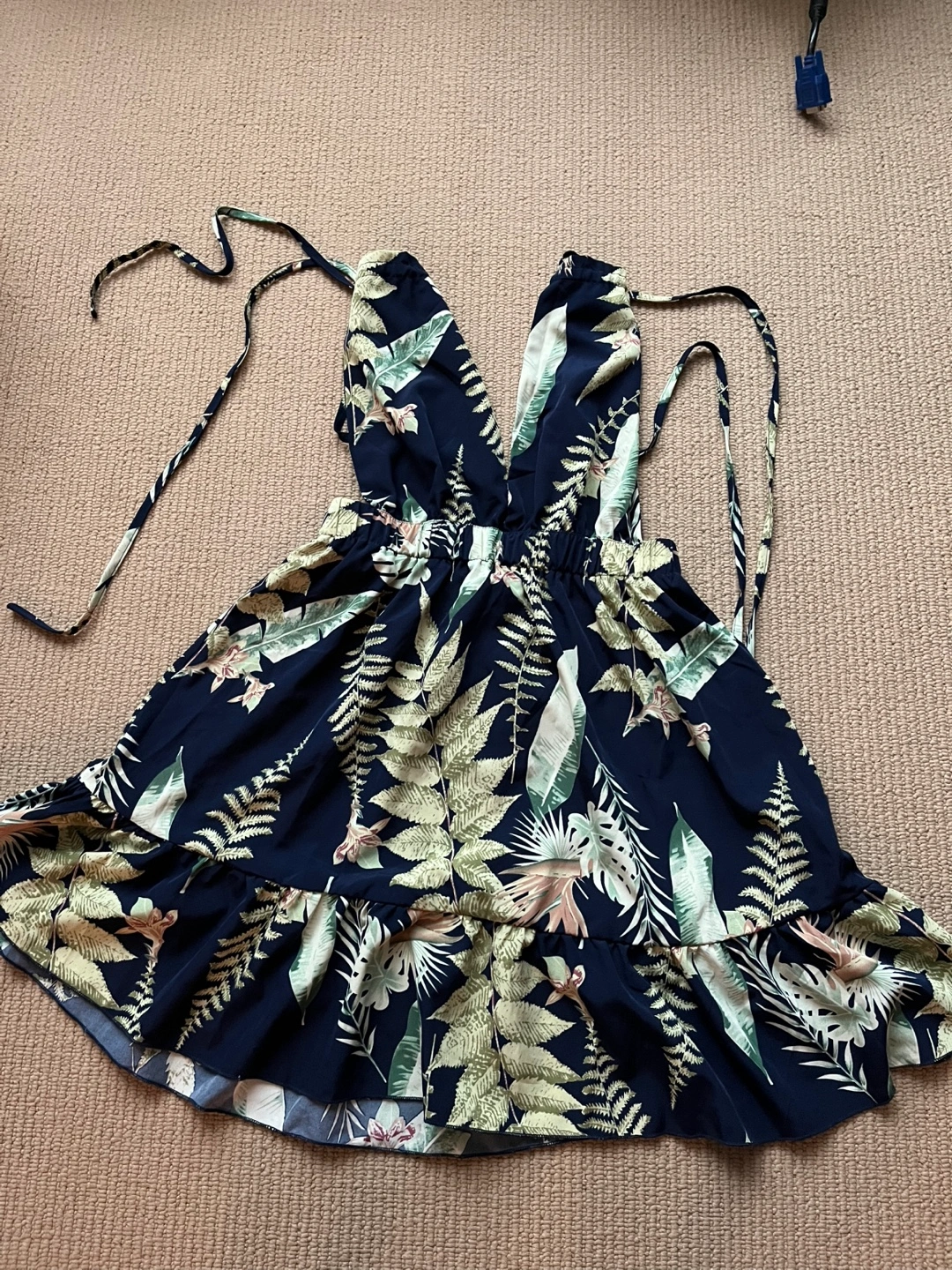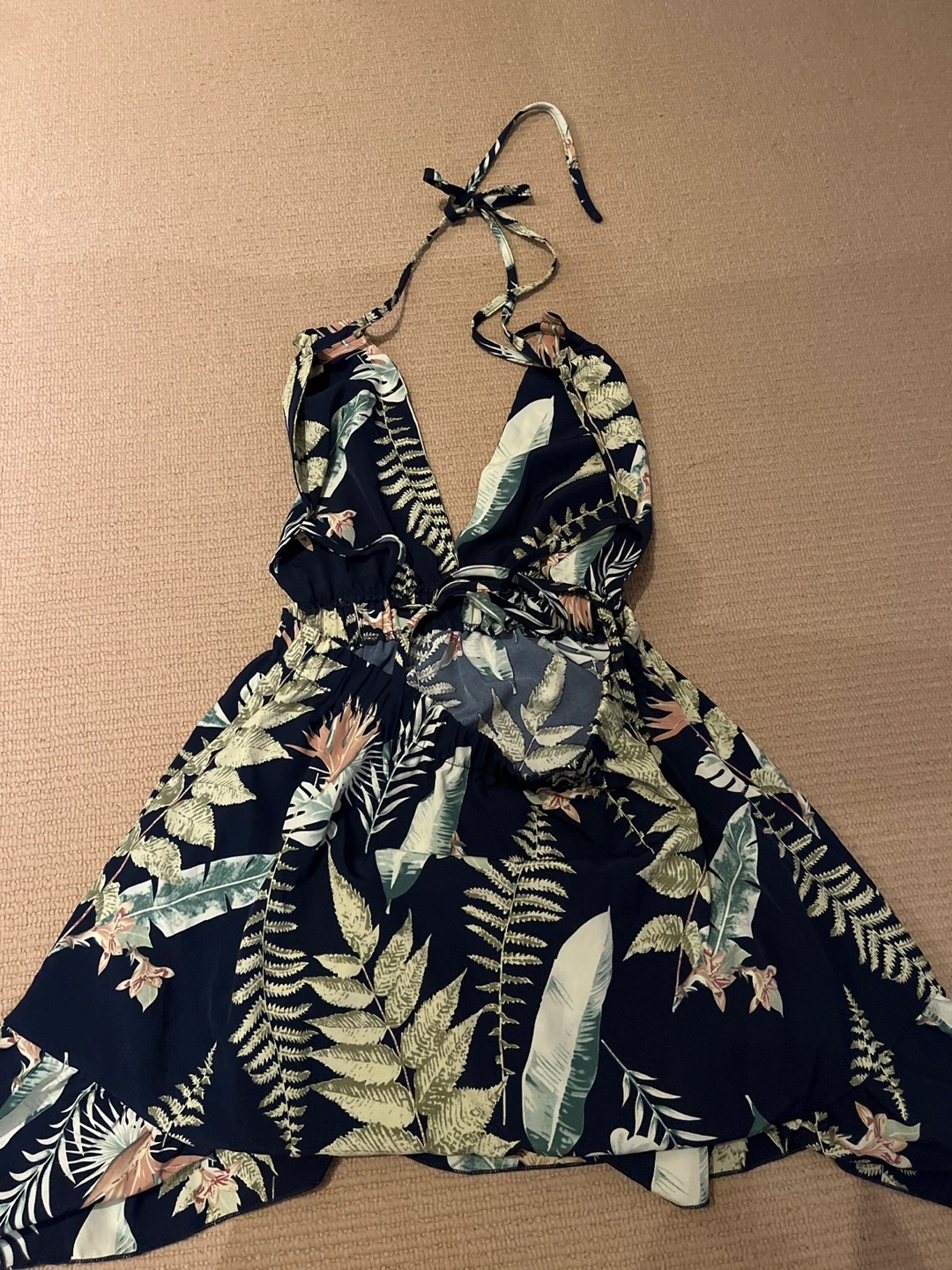 Adorable mini dress. Features a V-neck halter style and a ruffled hem. Floral pattern on a dark navy background. Lightweight material. Not my style.