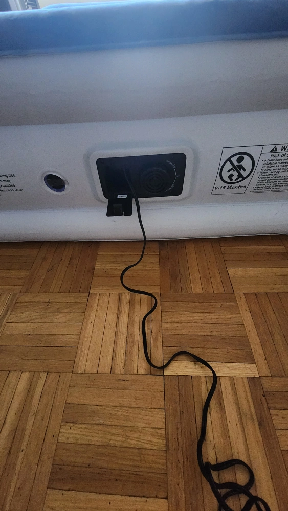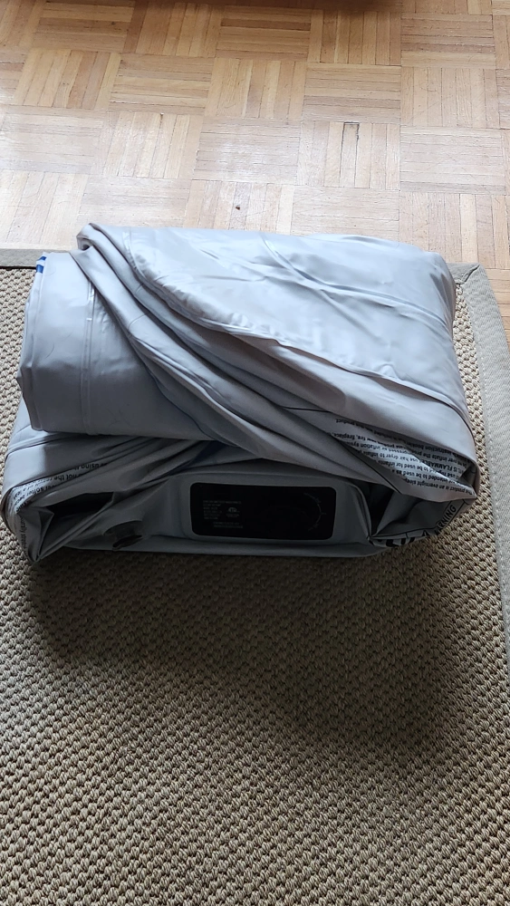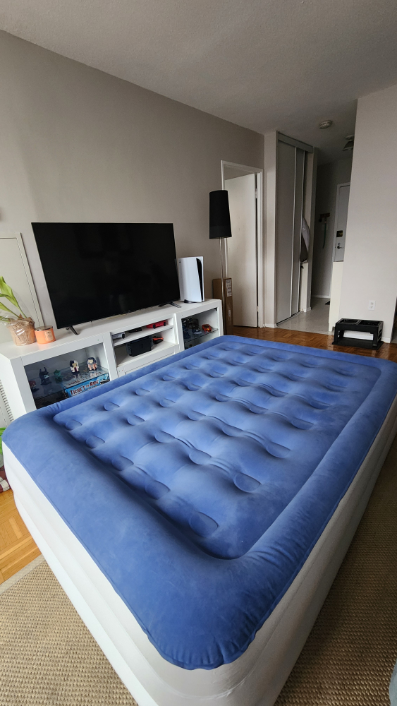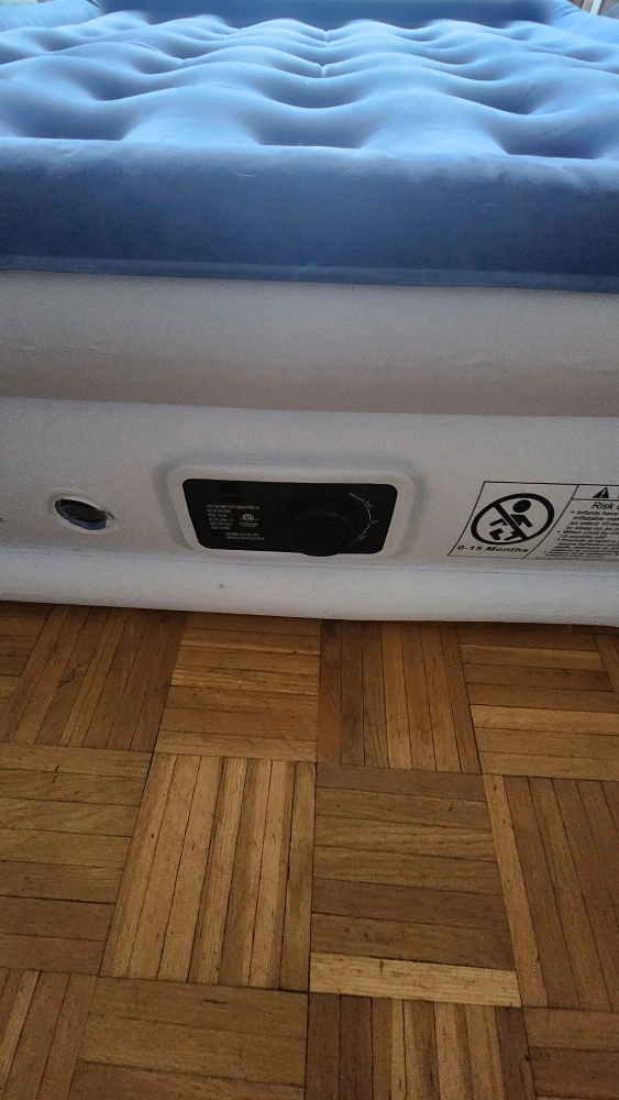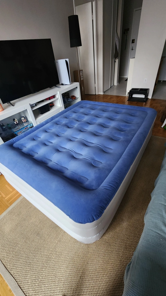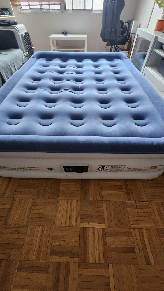 Queen-size inflatable mattress. Built-in electric pump for easy inflation and deflation. Folds neatly for storage. Blue flocked top. used twice, no leaks.