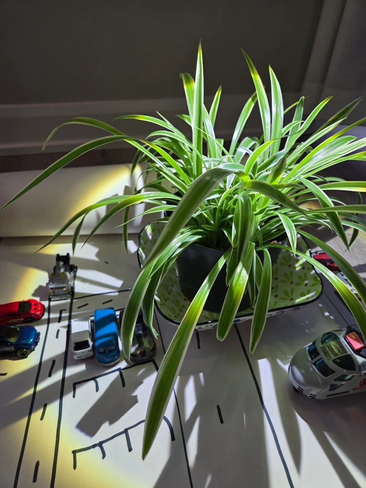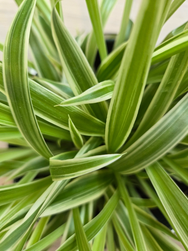 Healthy spider plant with variegated leaves. Planted in a dark-green plastic pot. The decorative bowl is not included.