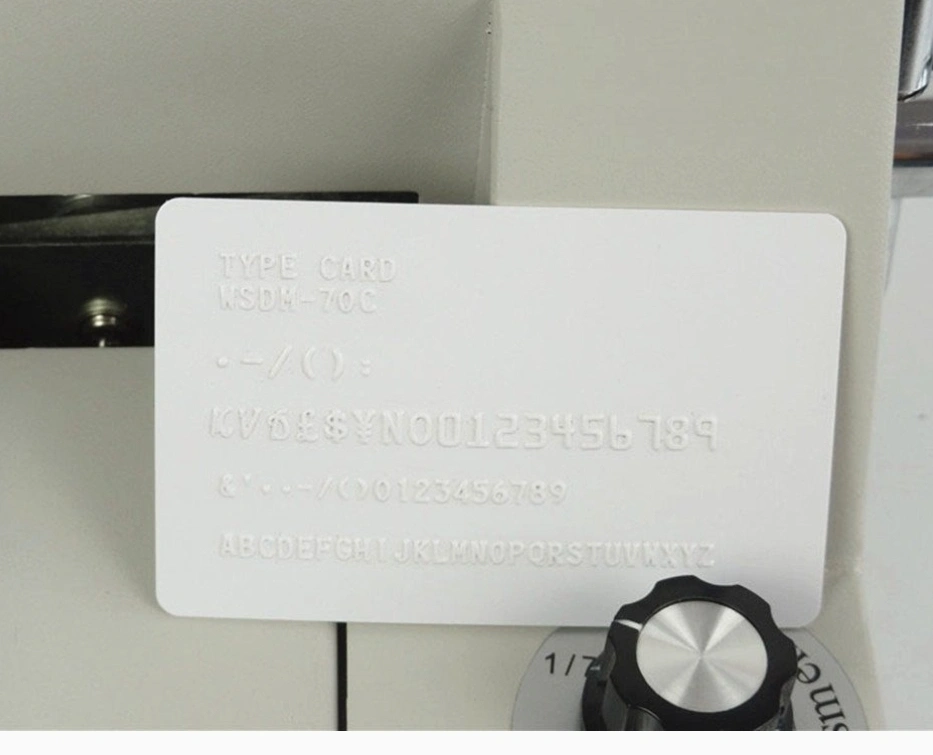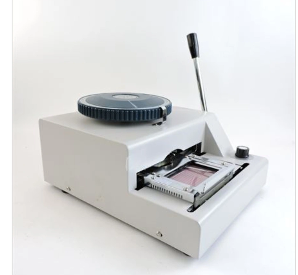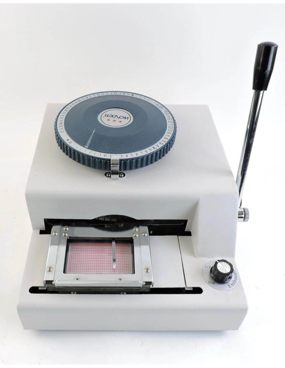 like new, manual plastic card embosser. Great for numbering membership cards, gift cards, or identification cards. Includes a hand crank and adjustable depth. Embossing wheel included. Instruction manual included.