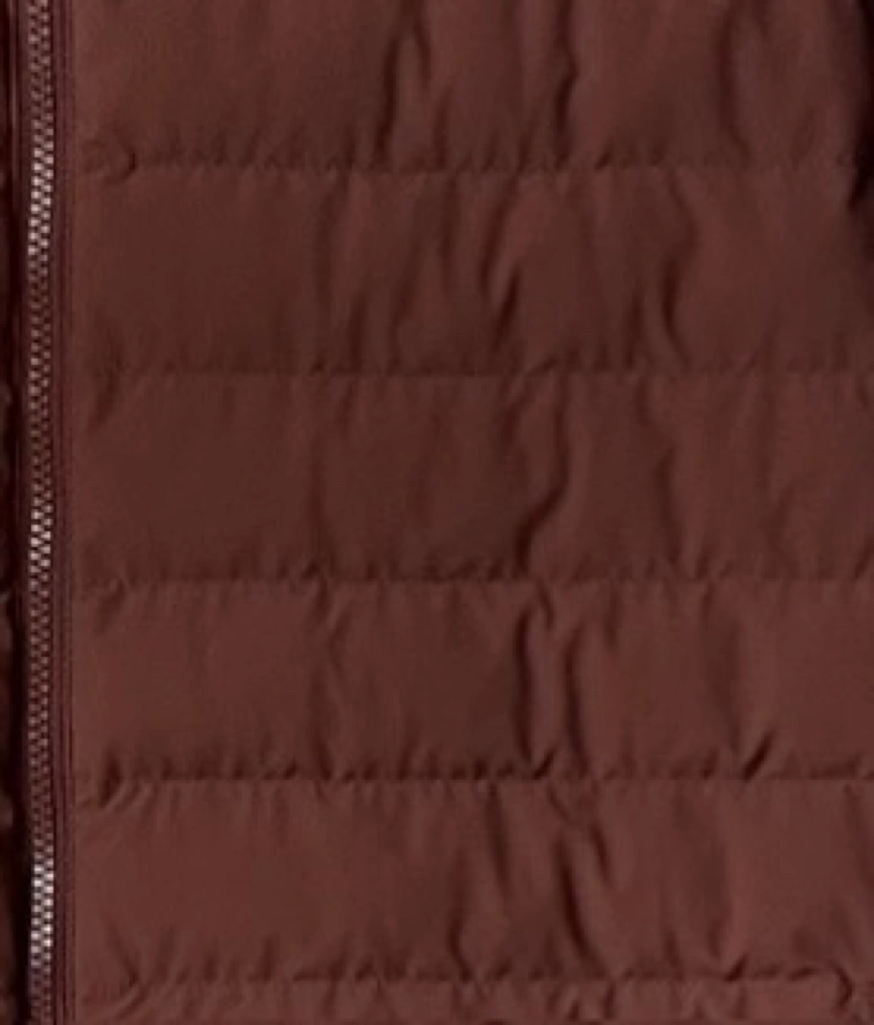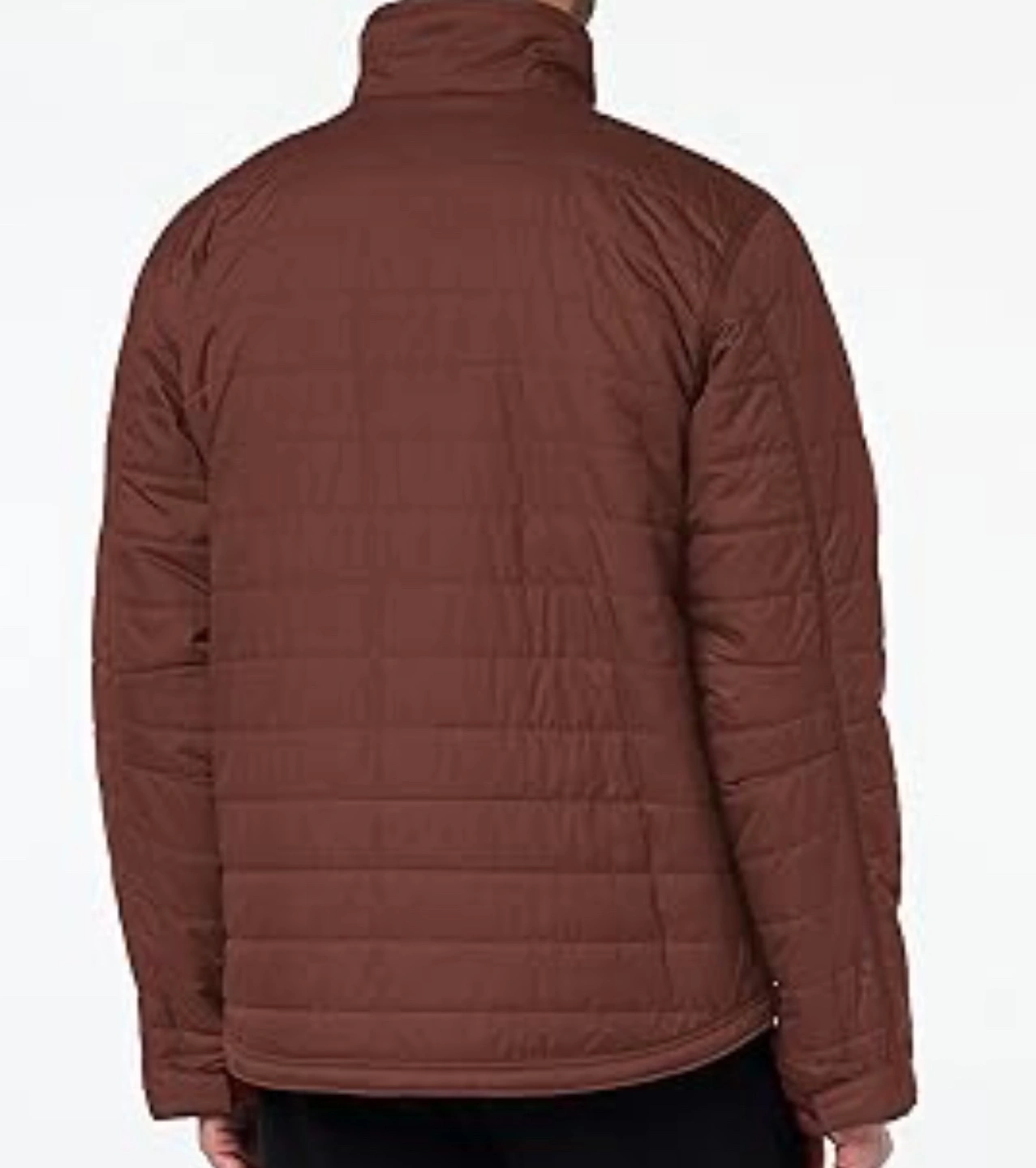Features a zipper closure and stand-up collar. Lightweight and warm.