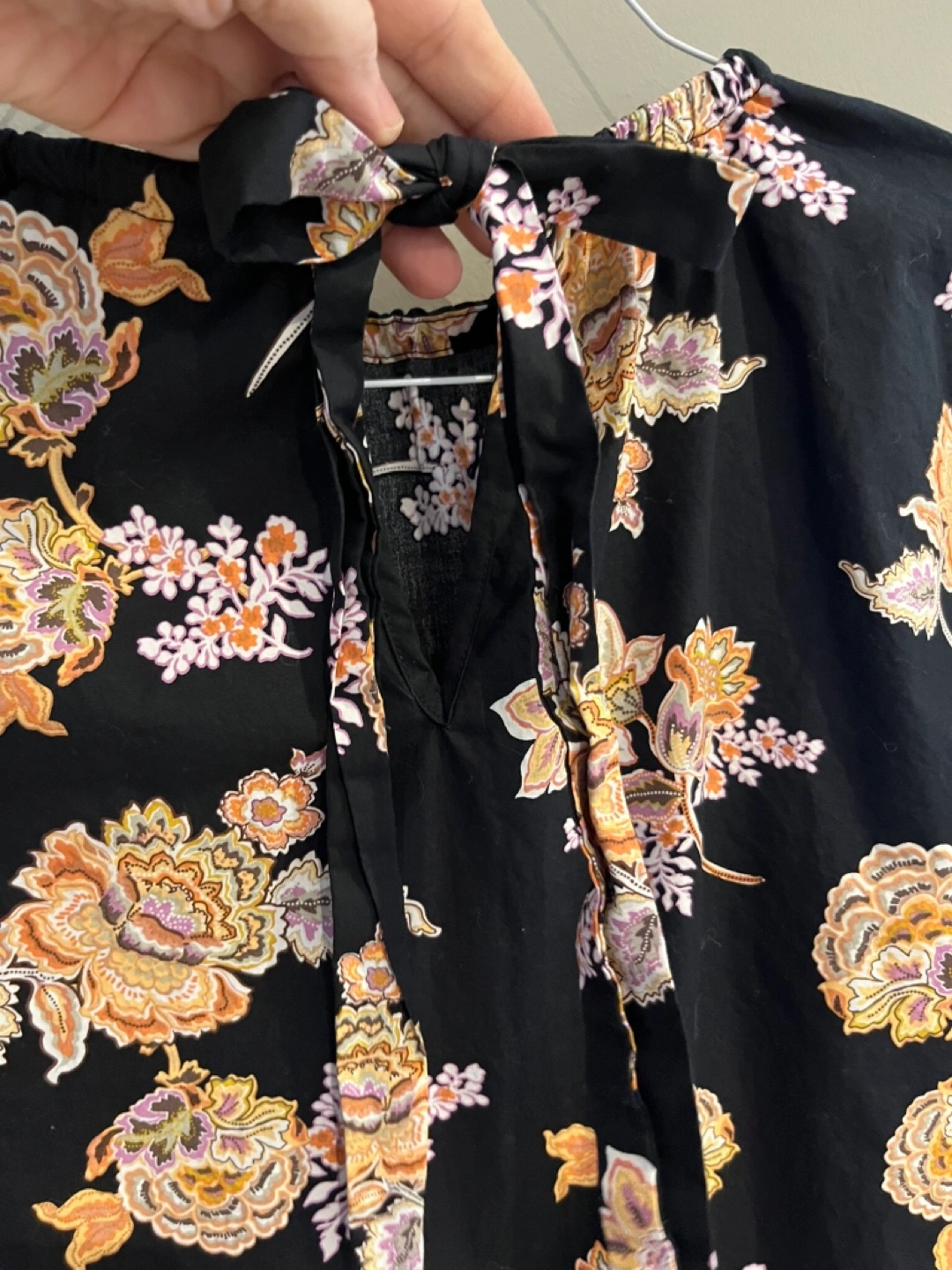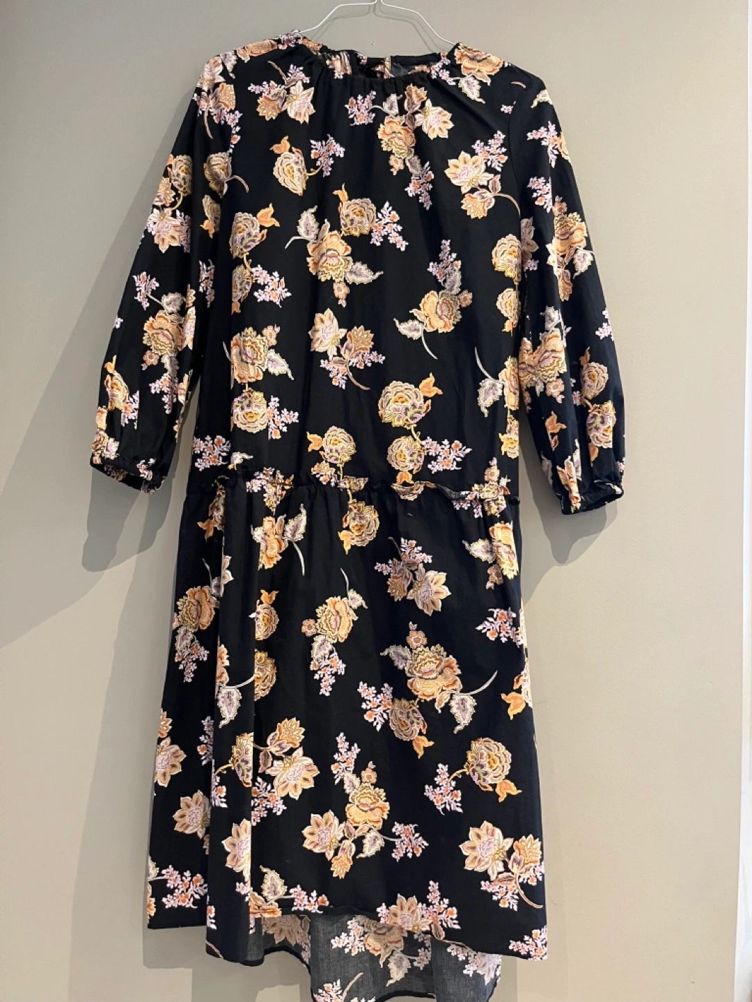 Black midi dress. Features a floral print, three-quarter sleeves, and a tie neck detail. Relaxed fit. A-line silhouette. High lo hem Cash only
