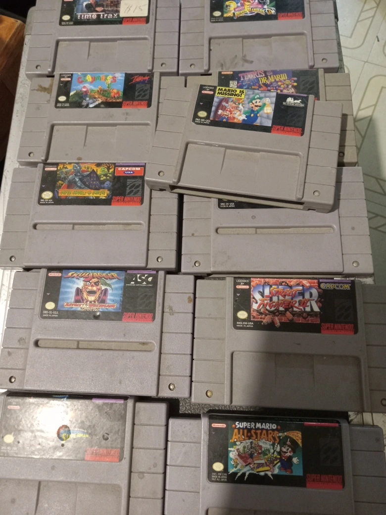 Collection of pre-owned Super Nintendo game cartridges. Includes titles like Super Mario All-Stars, Mario is Missing, and more. Games show wear consistent with use.