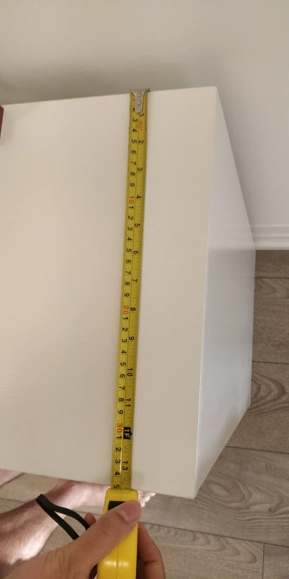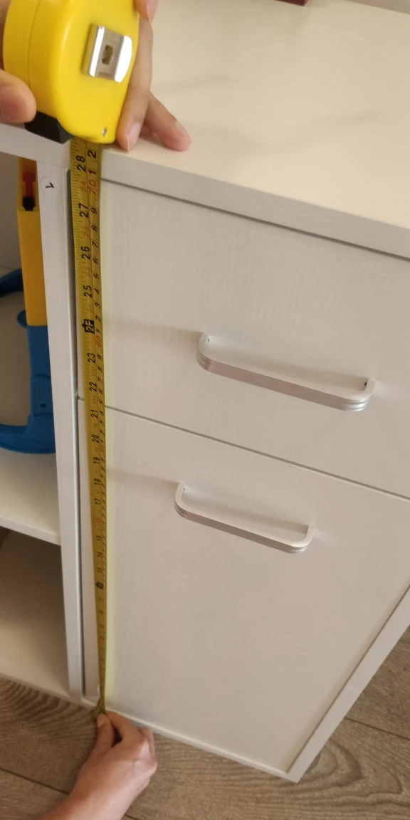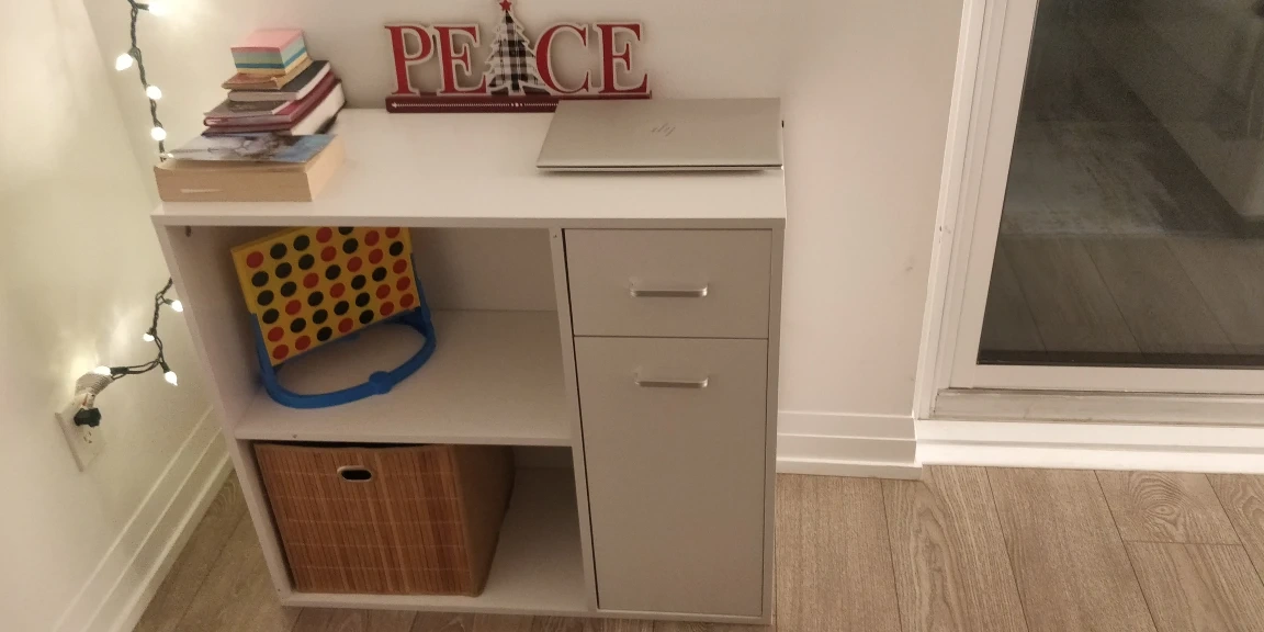 Small white storage cabinet. Two shelves and one drawer. Approximately 30cm wide and 29cm high. Ideal for small spaces.