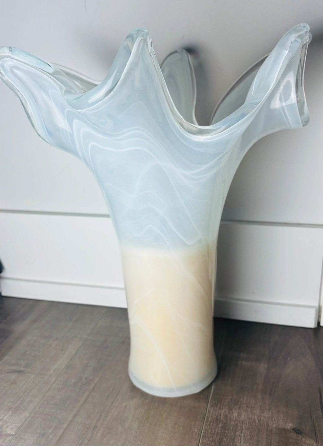 Beautiful glass vase with a unique swirled design. Features a blend of white and cream colors.