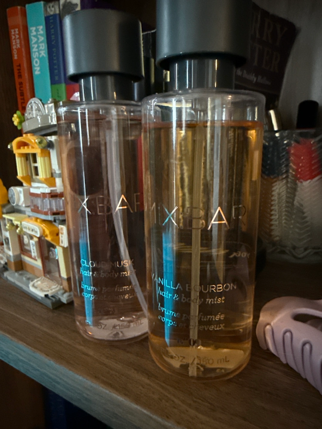 Set of two 150 ml XBAR hair and body mists. One is Cloud Musk, the other Vanilla Bourbon.