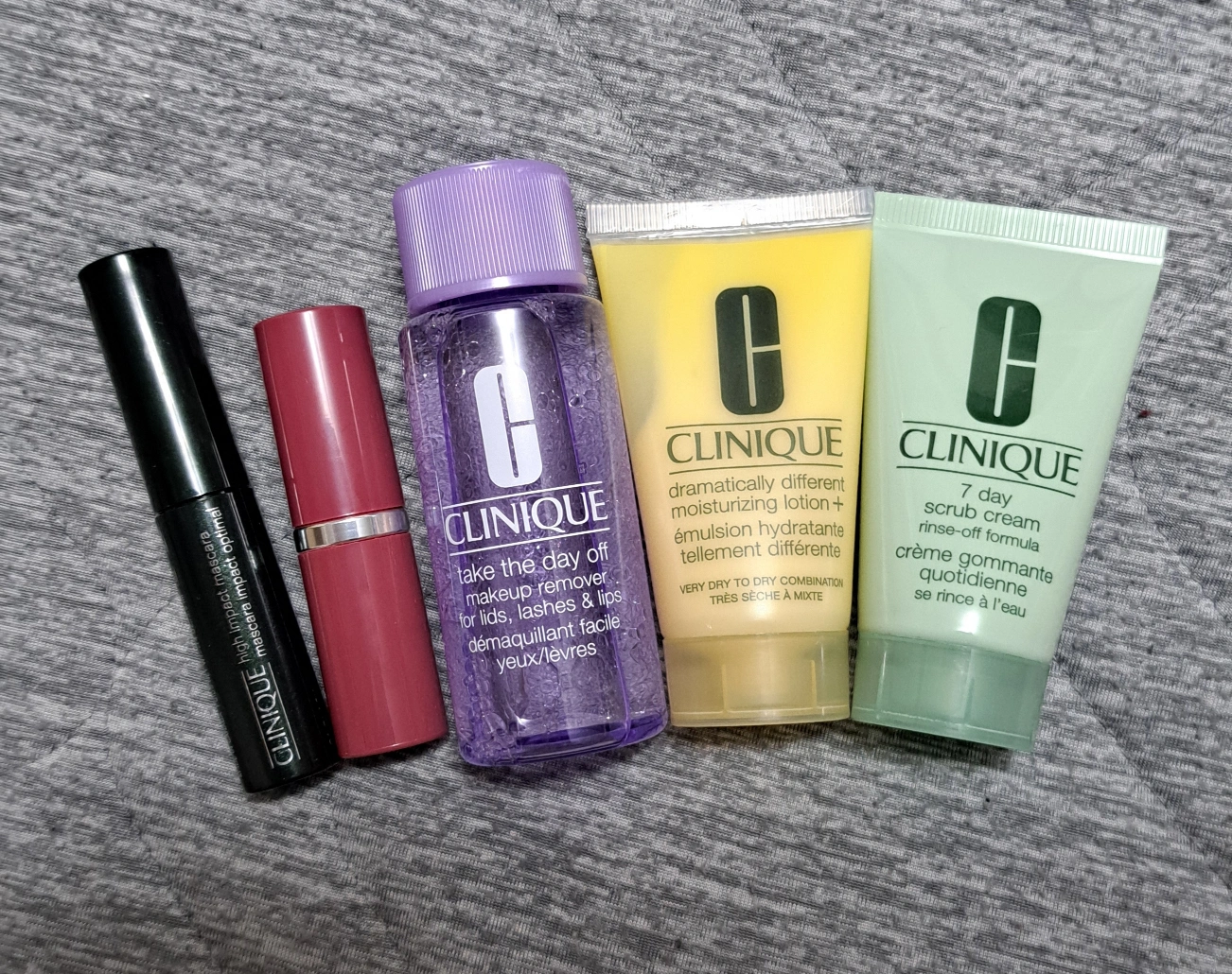 Clinique gift set. Includes makeup remover, moisturizer, scrub, and lipstick. Travel or sample sizes. New, unused.