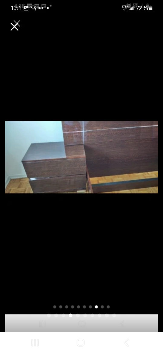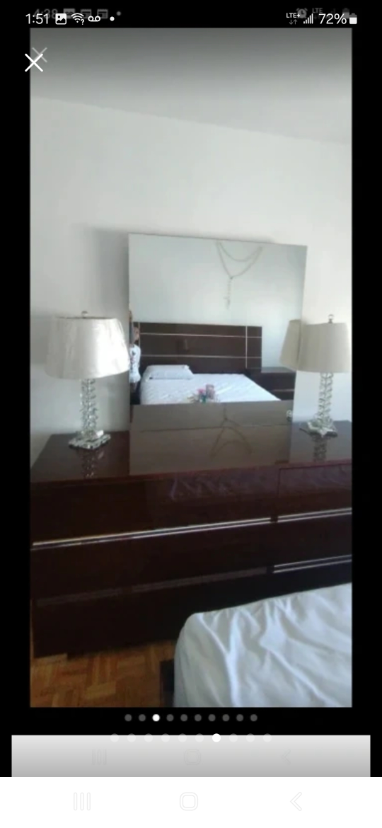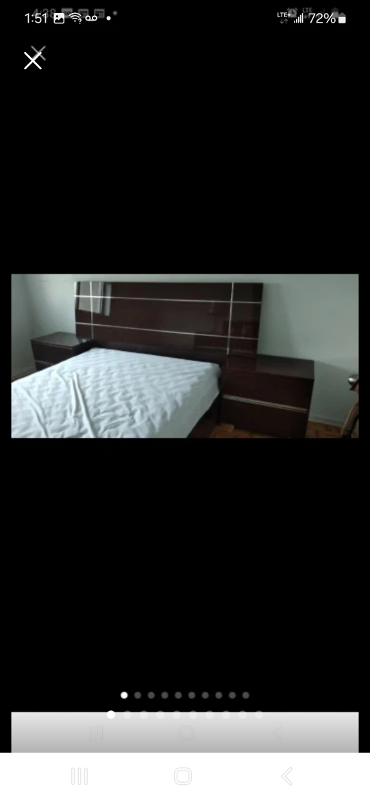 Queen size bedroom set. Includes headboard, frame, and two nightstands. Dark brown finish. Modern style. Solid wood construction.