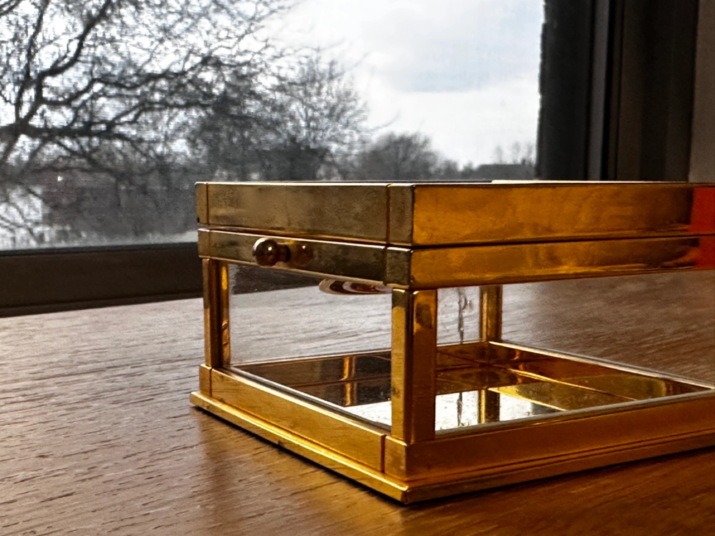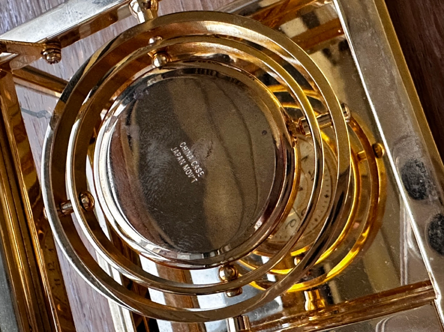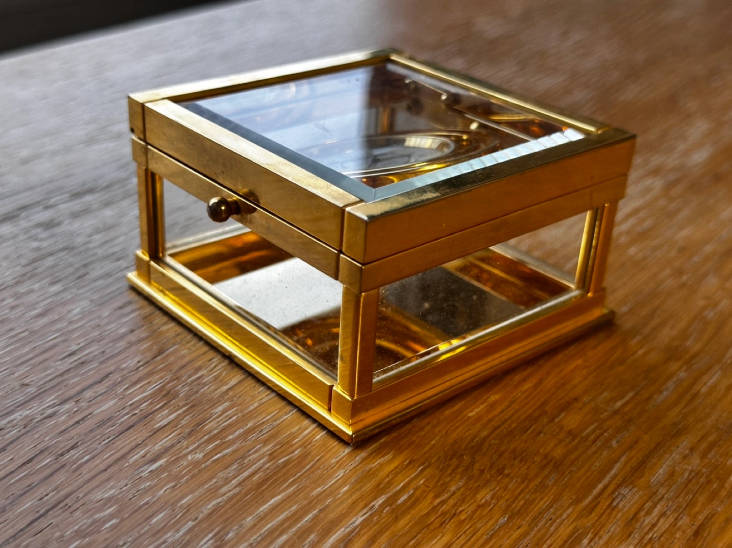 Small gold-tone clock encased in glass. Quartz movement. Japan made. Perfect for a desk or shelf.