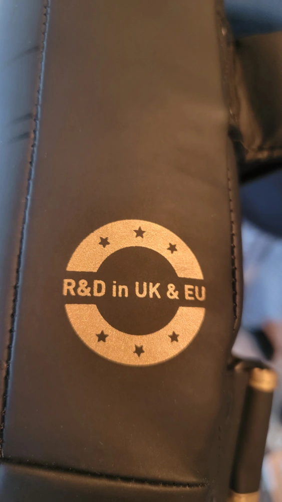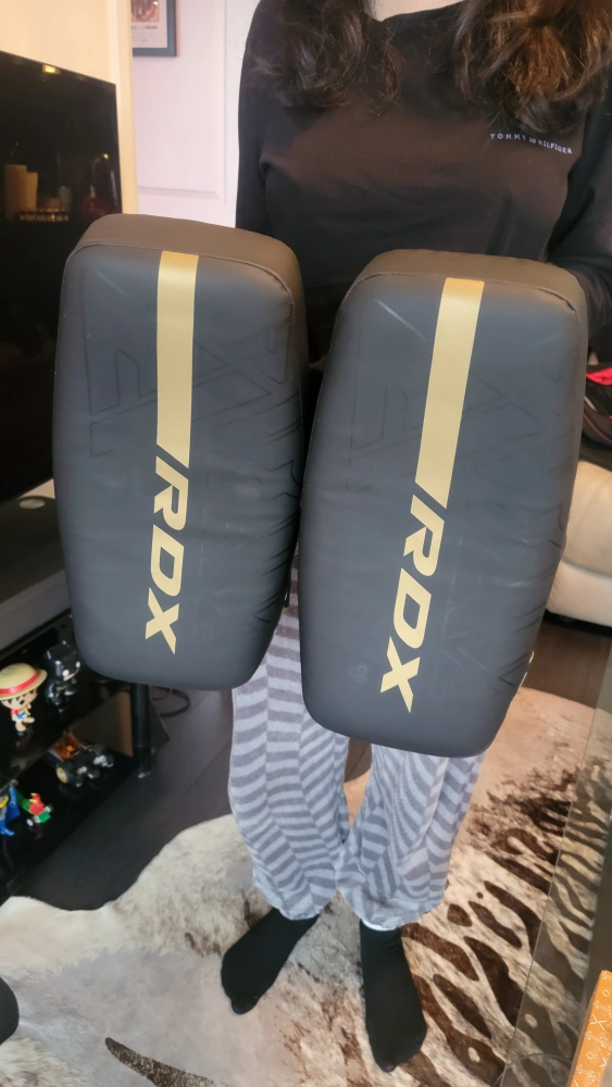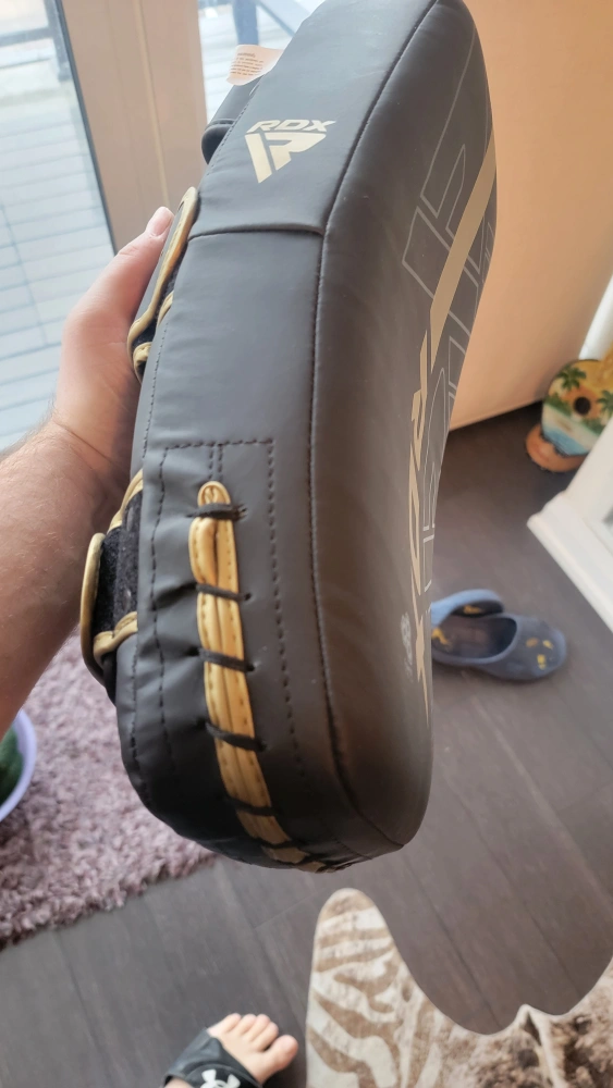 Pair of RDX Kara kickboxing pads. Black and gold colour scheme. Durable construction. Excellent for training.