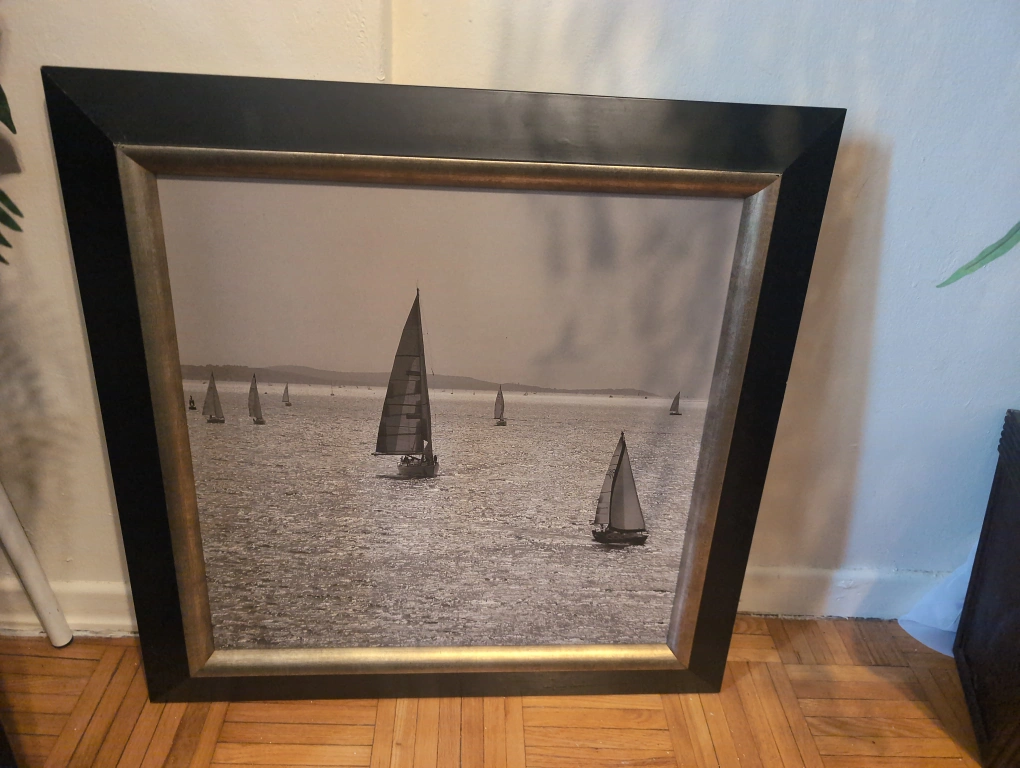 Large framed print featuring sailboats at sea. Sepia toned image. Black frame with gold inner border. Great for nautical themed decor.