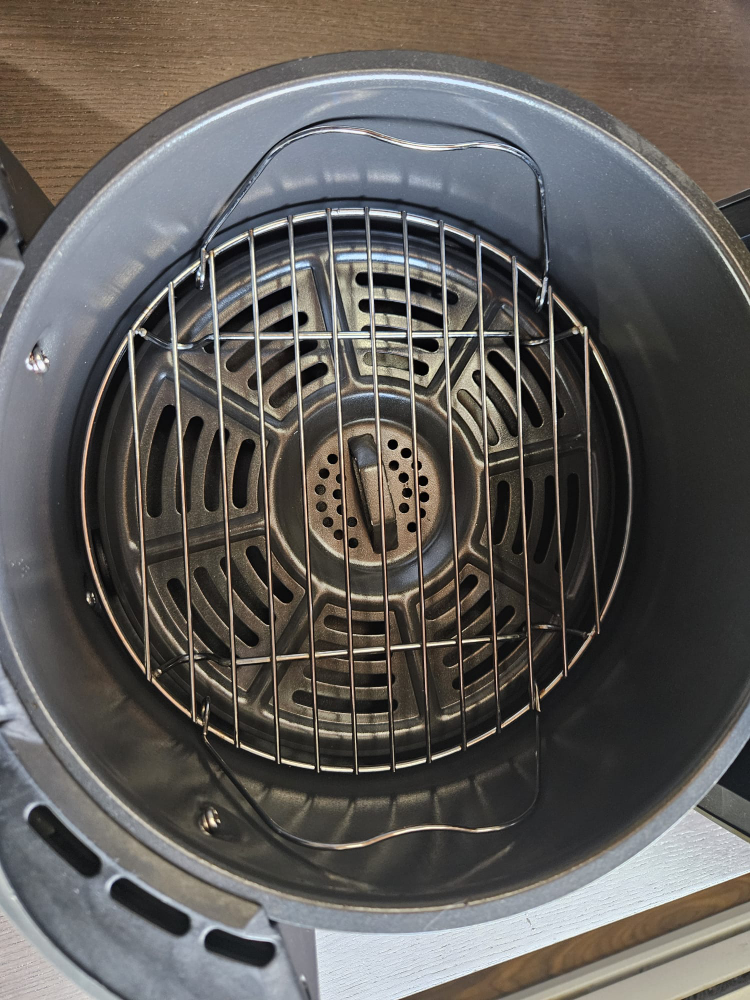 Digital air fryer. Features multiple cooking functions. Includes a crisper plate. Grey and black.