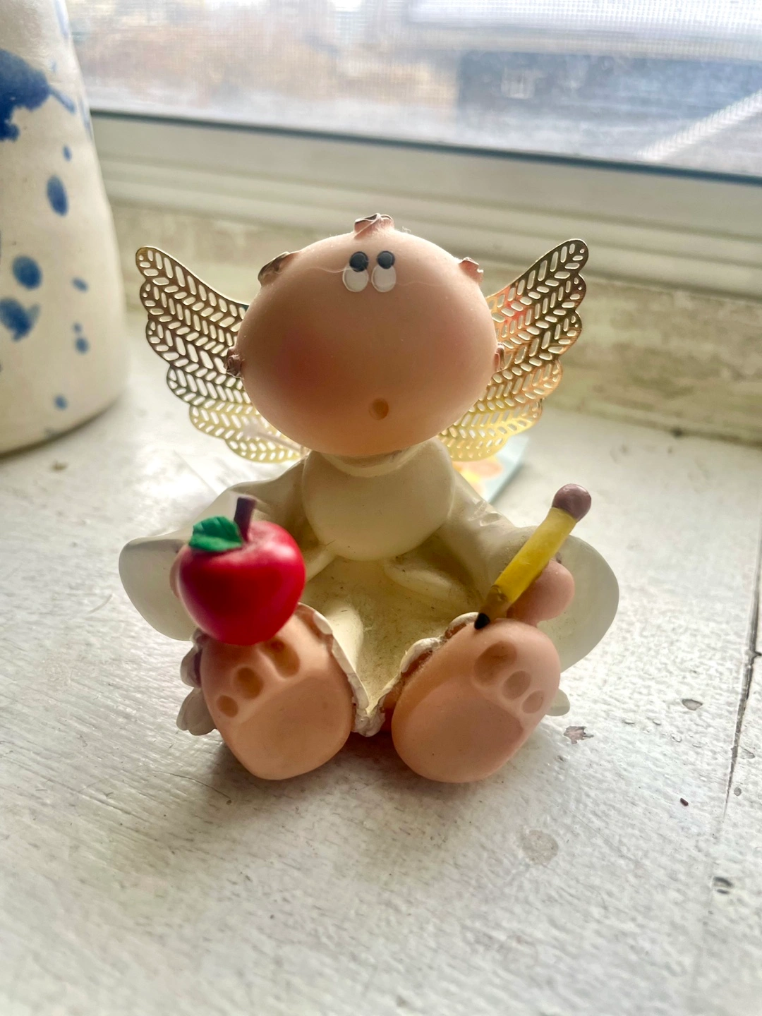 This figurine is brand new with original tags. Ceramic with gold metallic mesh wings, holding an apple and pencil in hand.