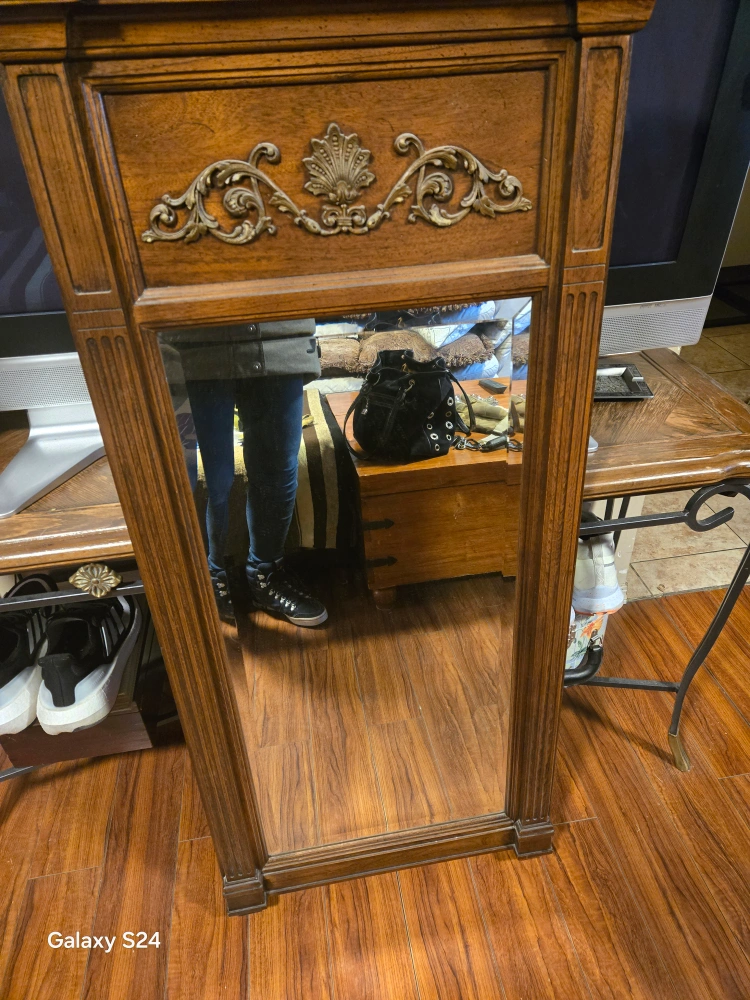 Tall, elegant floor mirror. Dark wood frame with ornate detailing. Excellent for adding a touch of classic style to your home. Pre-owned.offers welcome
