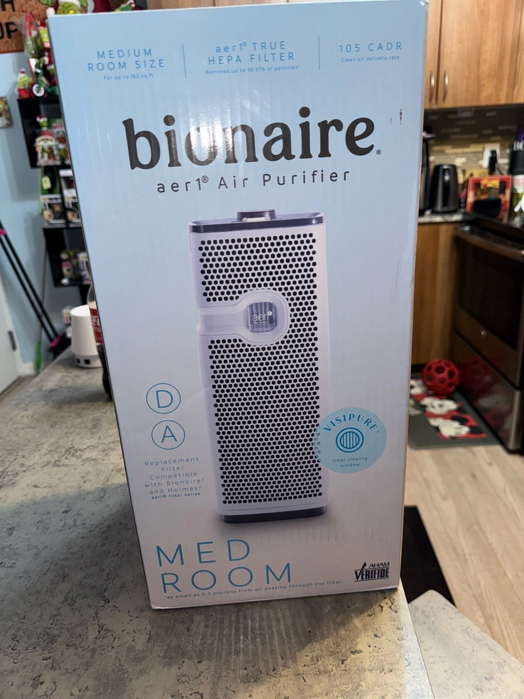 Bionaire aeri® air purifier. Washable pre-filter, True HEPA filter, ion technology. Cleans air distributed throughout the room. Three speeds. Visipure filter viewing window. Suitable for medium-sized rooms up to 162 square feet.