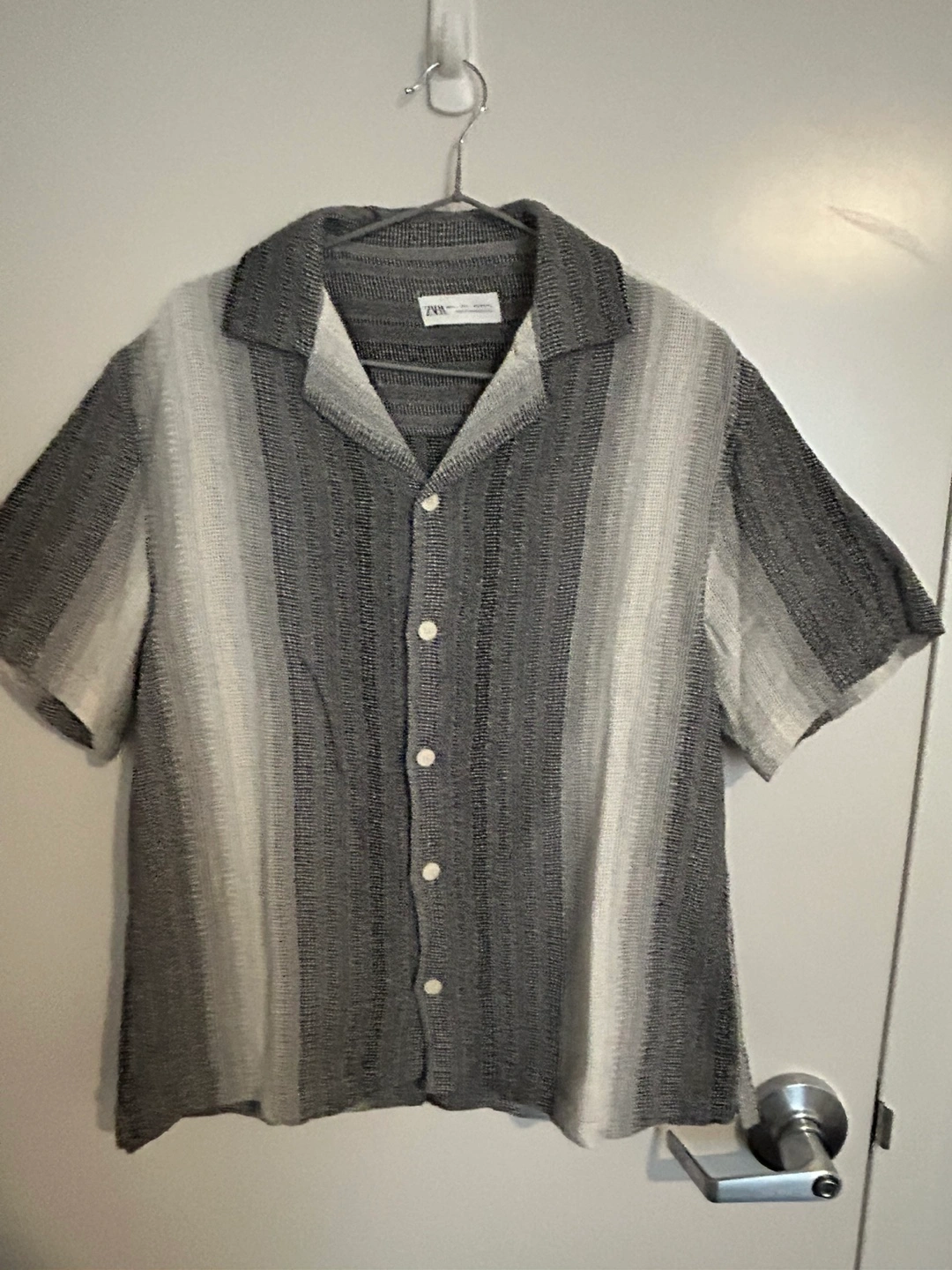 Men's short-sleeve collared button-up shirt. Features a grey and white vertical striped pattern. Relaxed fit. Like new condition.