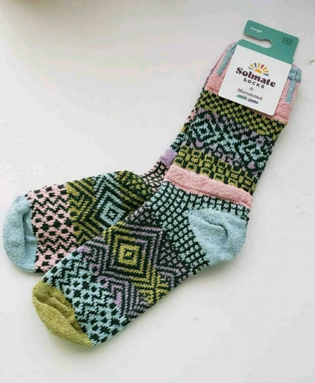 188Pair of colourful crew socks. Large size. Mismatched pattern. New with tags. retail over 30.00