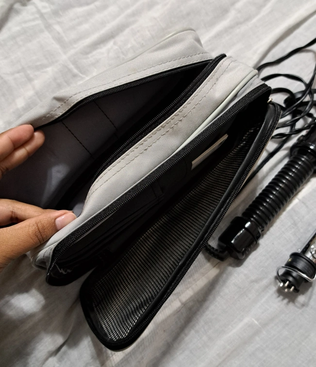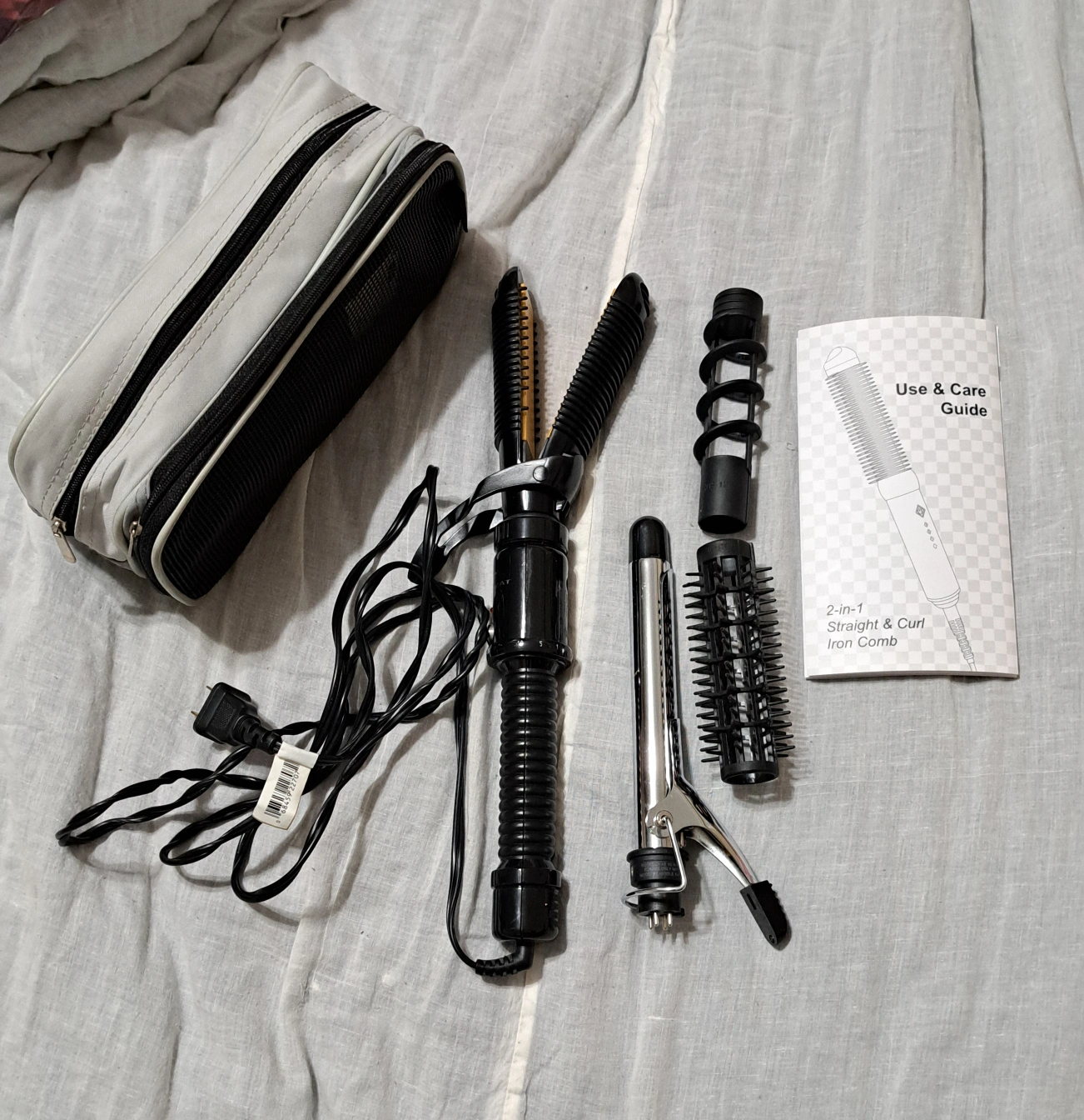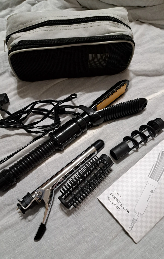2-in-1 hair styling tool. Includes straightener and curling iron attachments. Comes with a carrying case and instruction manual. Great for travel.