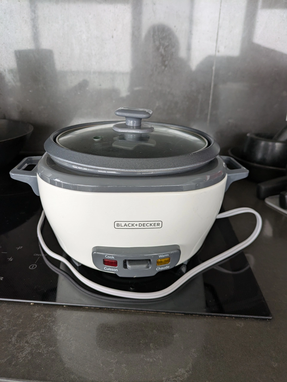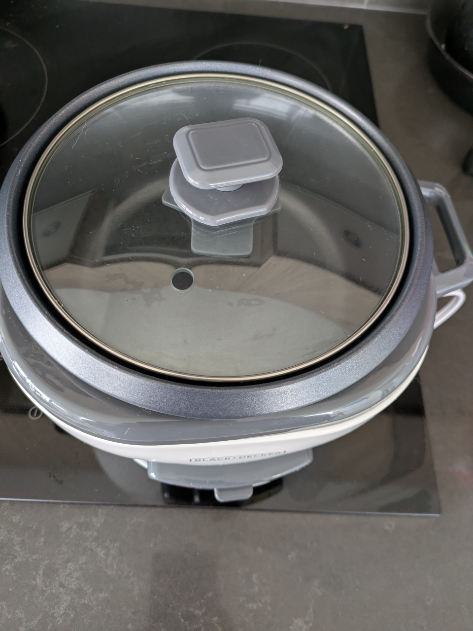 Small rice cooker with glass lid.