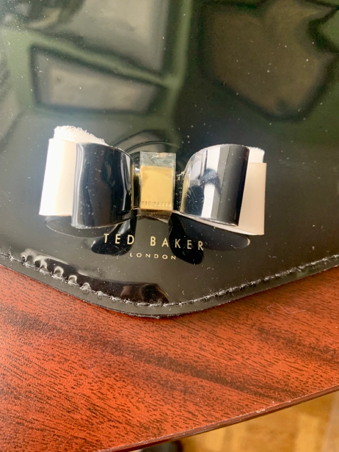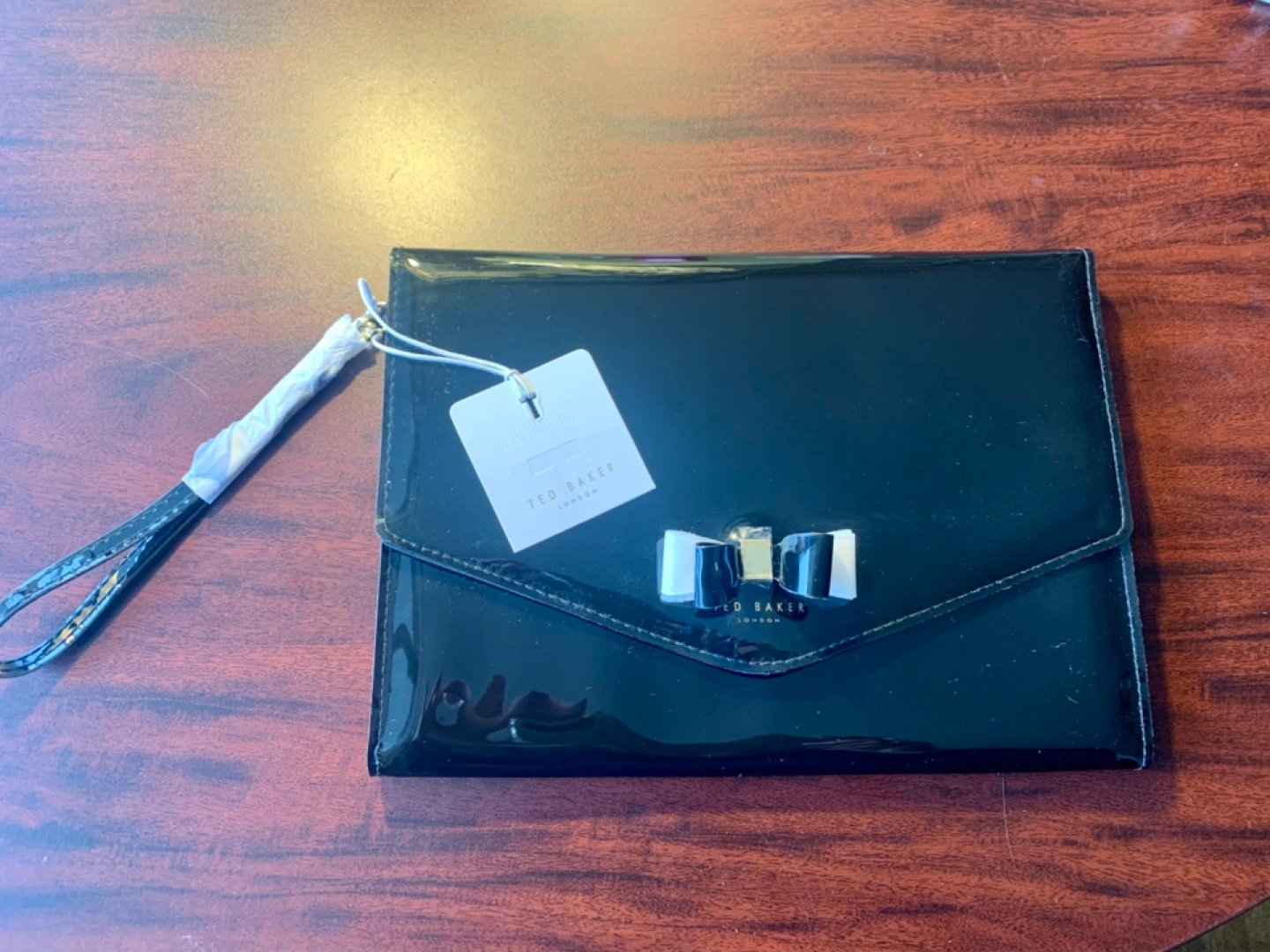 Black patent leather envelope clutch. Features a signature Ted Baker bow detail. Wristlet strap included. New with tags, protective film on finishings and styrofoam padding to keep the bows perfect.