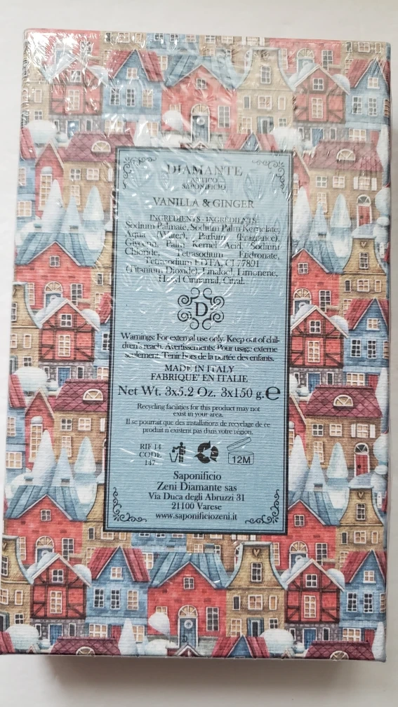 Three bars of Diamante Luxury Soap in Vanilla & Ginger scent. Made in Italy. New, unopened box.