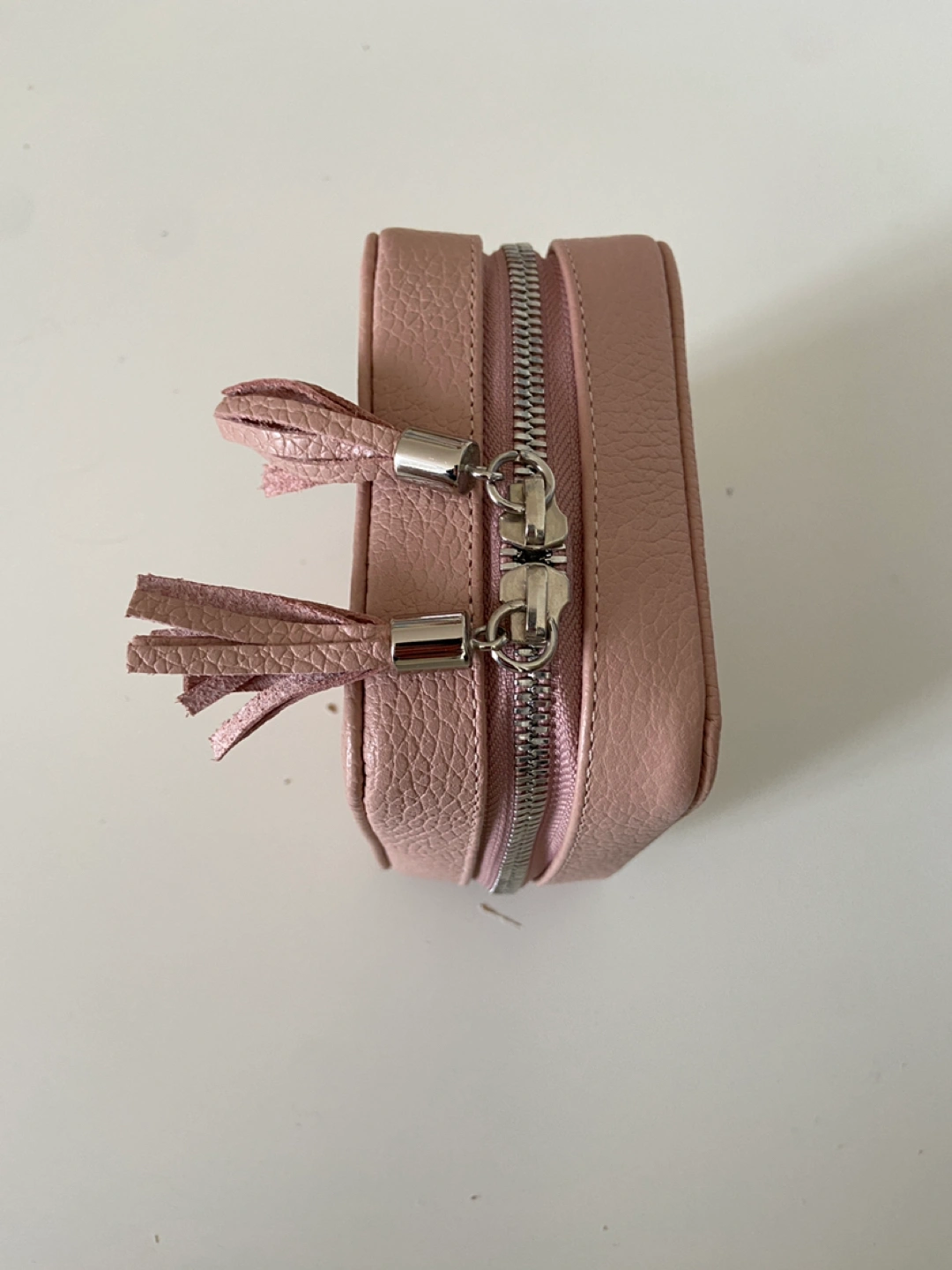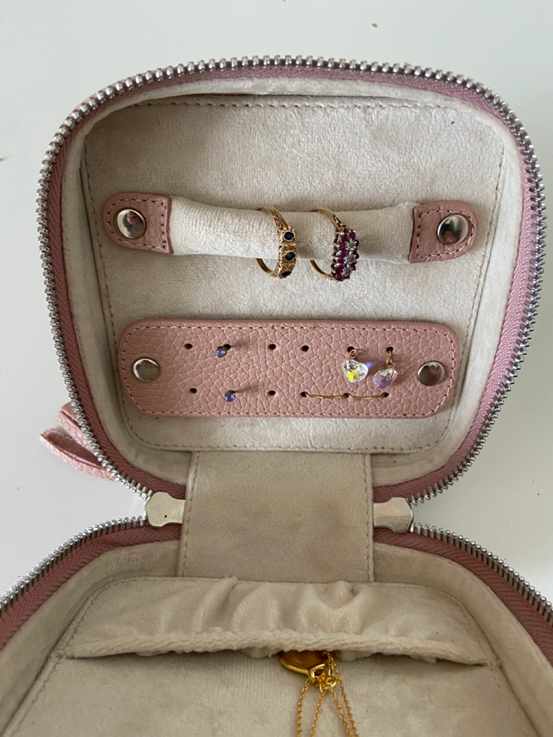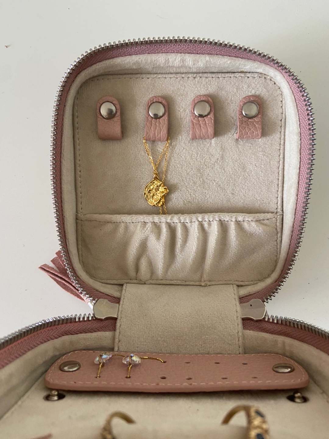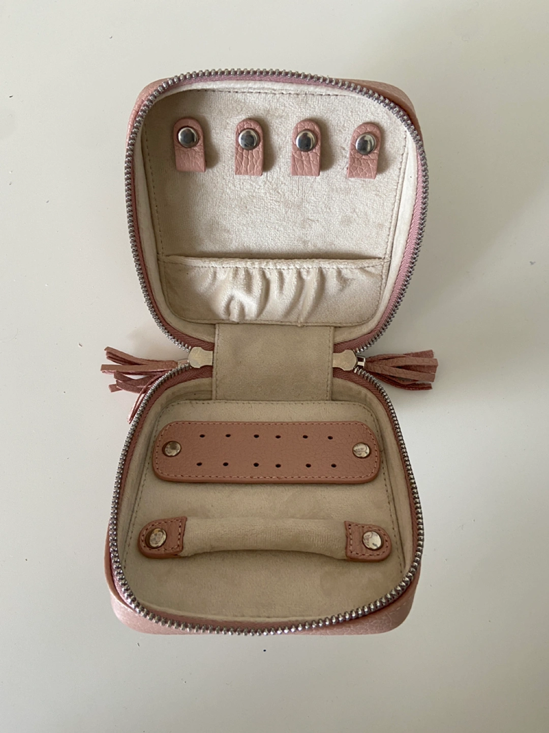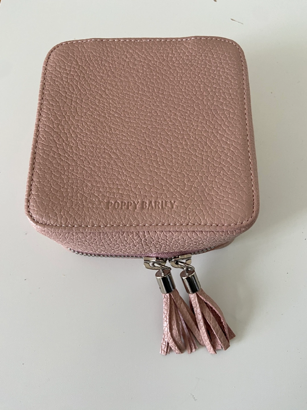- Poppy Barley leather travel / storage case for jewelry, dusty pink colour - Stores rings, earrings, necklaces etc neatly and prevents tangling and damage during travel - Soft inner lining to protect pieces - Inner leather pieces can be opened / removed with snap clips to make securing jewelry easier - Near new condition, barely used - Retail price was CAD $145 pre tax