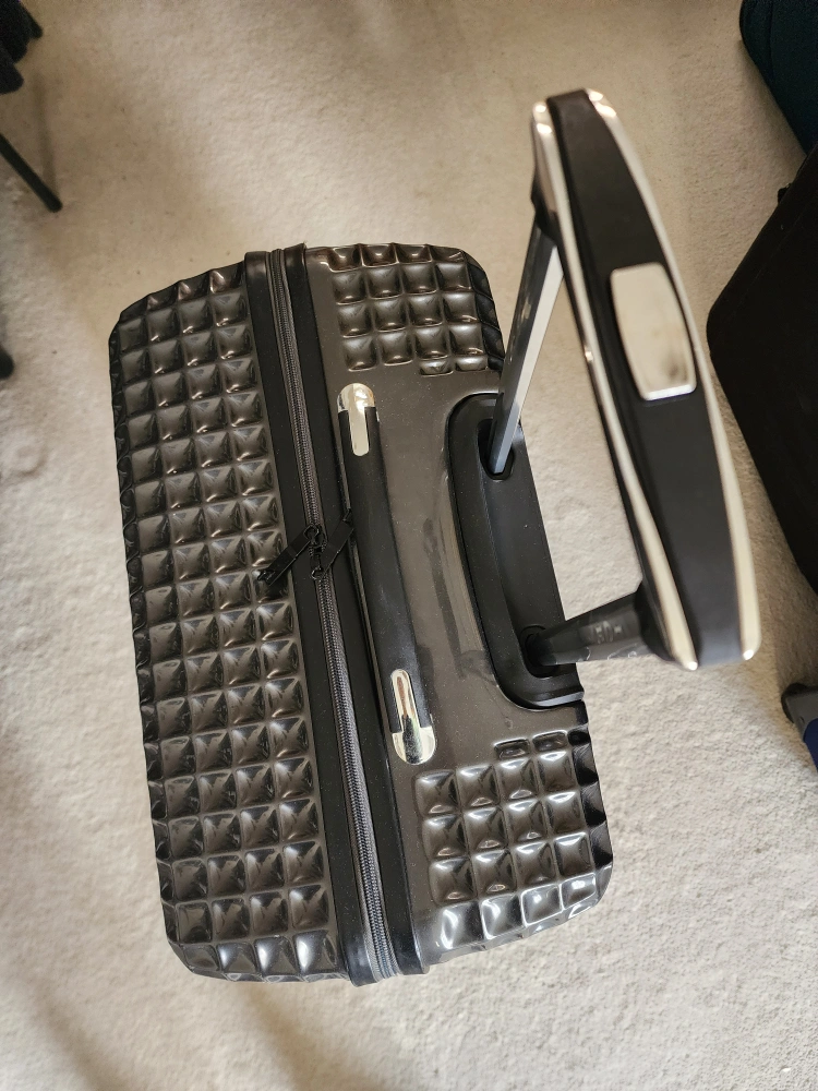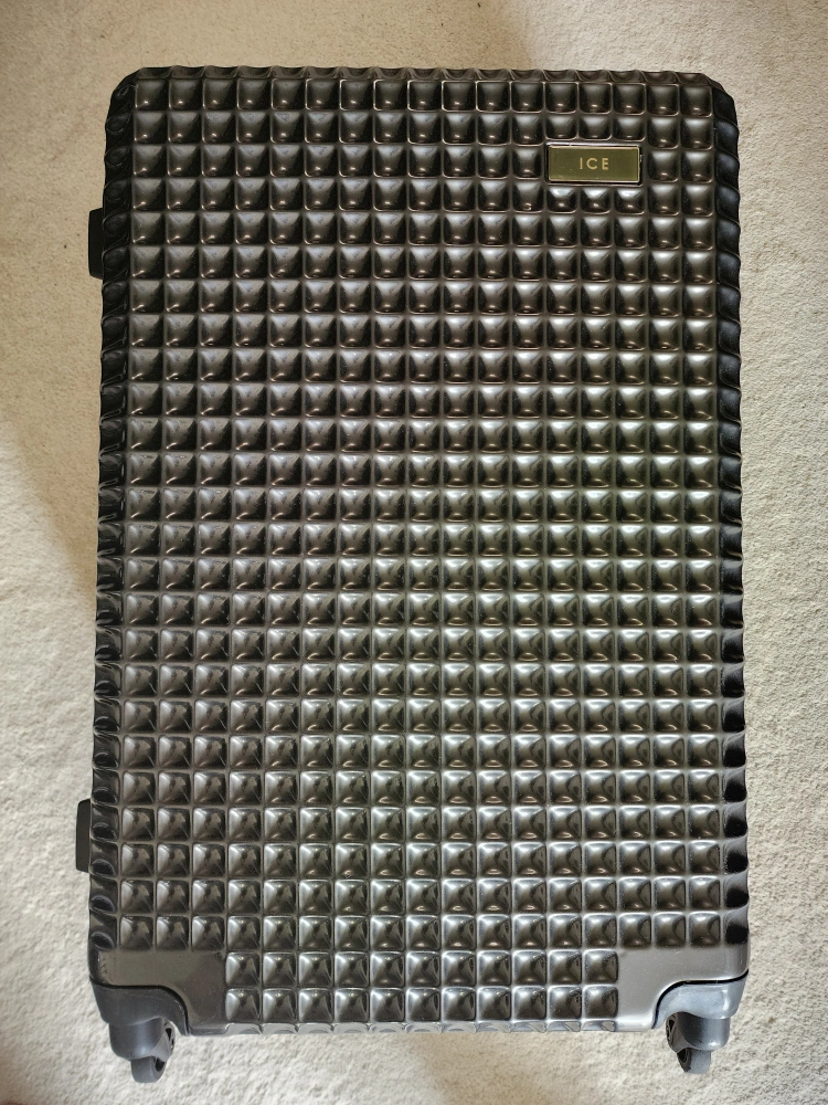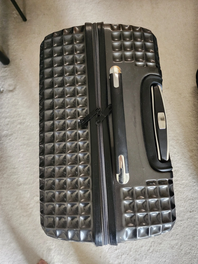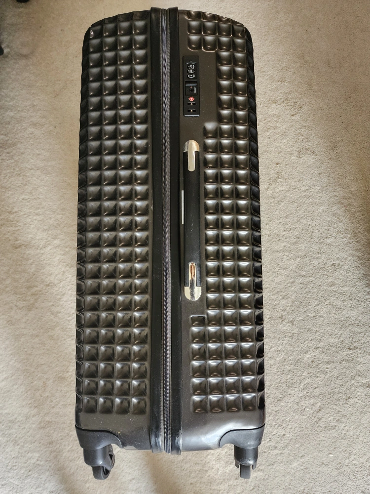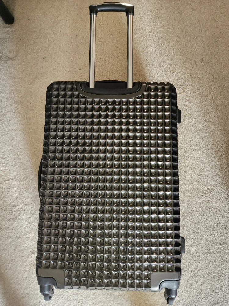 Made of durable ABS Hard-shell suitcase. Dark grey with textured surface.