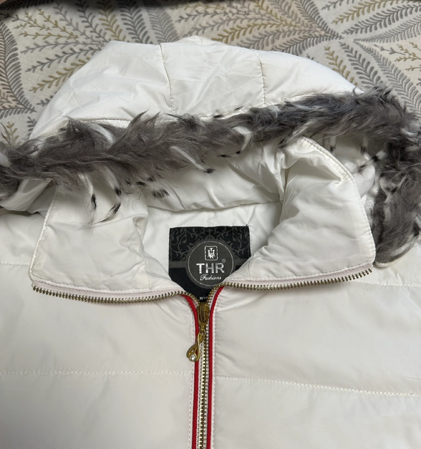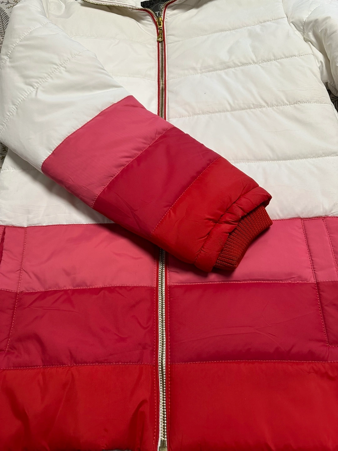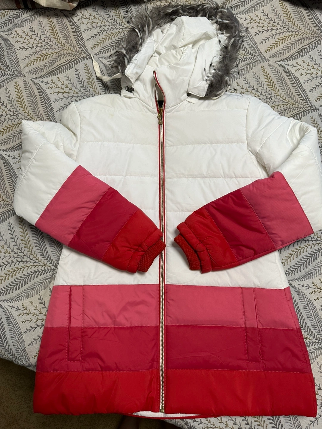 Women's hooded jacket. Features a colour block design in white, pink and red. Gold zipper. Faux fur trim on the hood. Long sleeves with ribbed cuffs. Pockets.