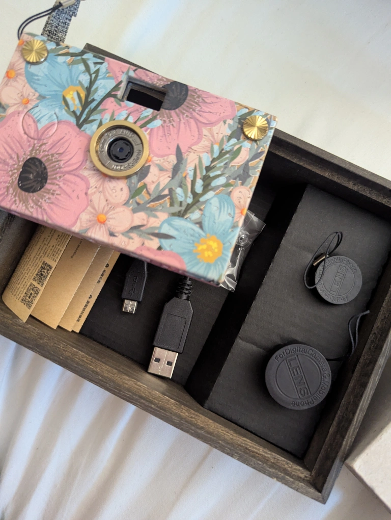 Film-like quality but saves photos digitally. If youre looking for the nostalgia of film photography, this is a fun camera to use. 35mm, f2.2, 8MP lens is the default. No flash feature.