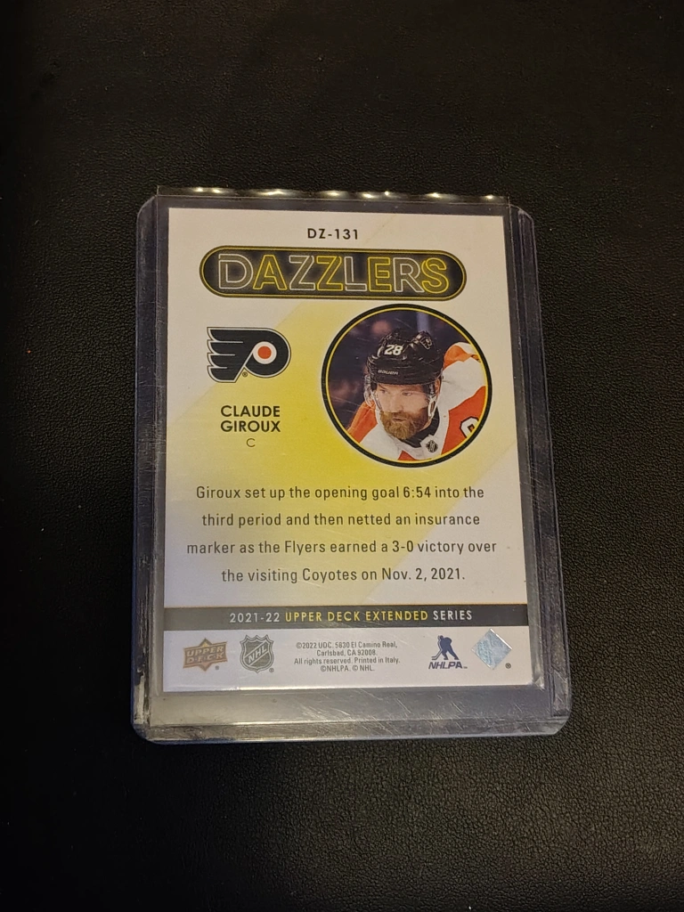 Claude Giroux hockey card. Part of the 2021-22 Upper Deck Extended Series Dazzlers subset. Card number DZ-131. In a protective case.