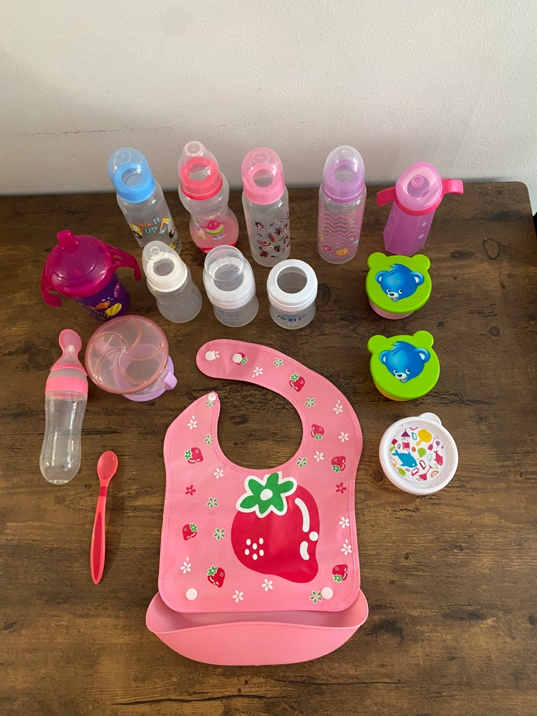 221Baby feeding set. Includes several bottles, sippy cups, bowls, spoons, and a bib. Great for babies and toddlers. Need to purchase nipples.