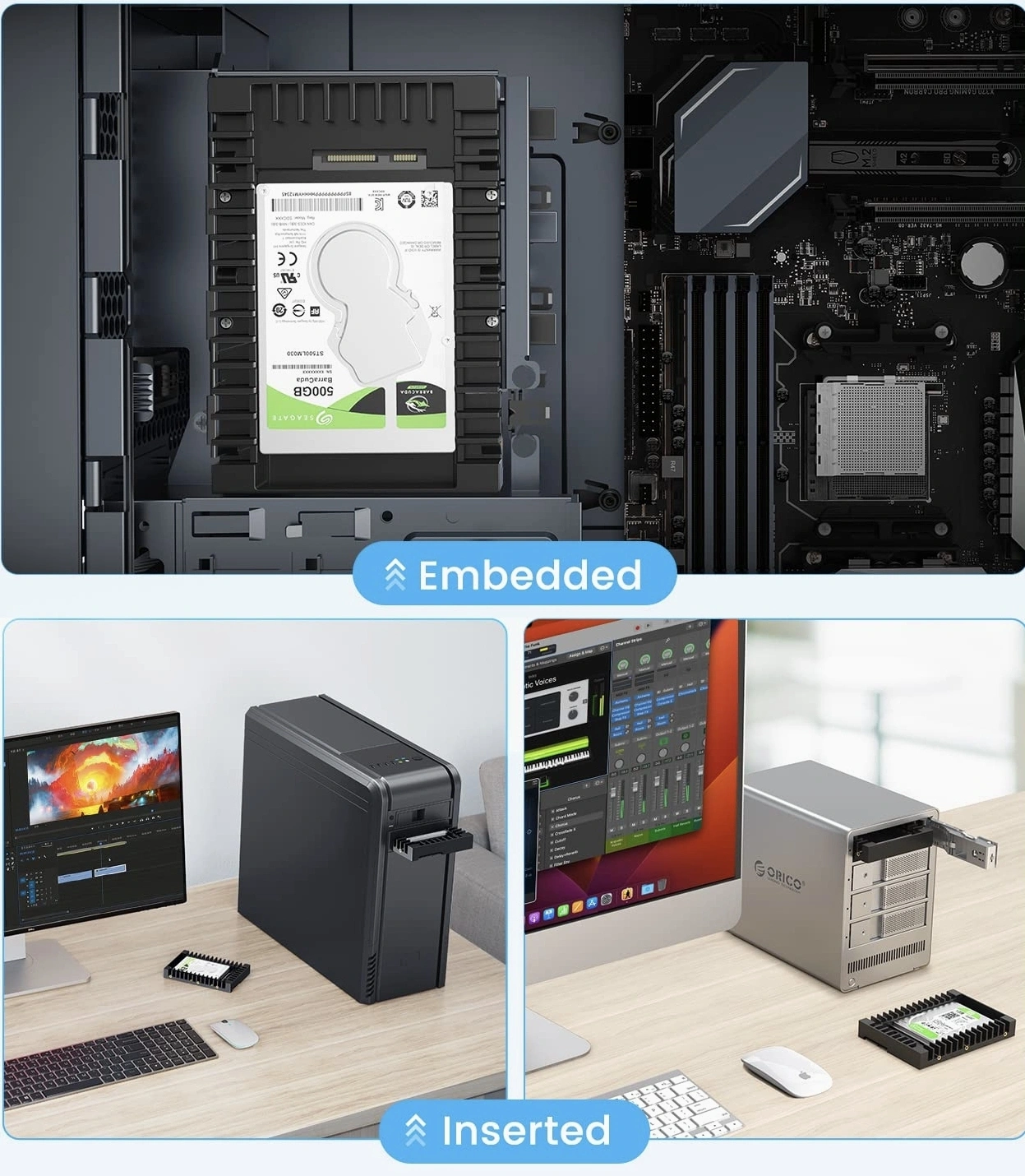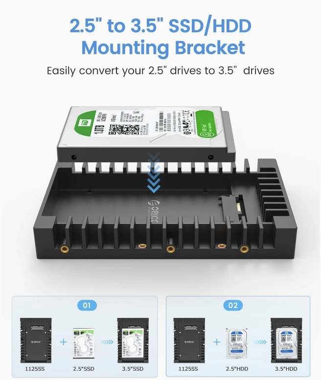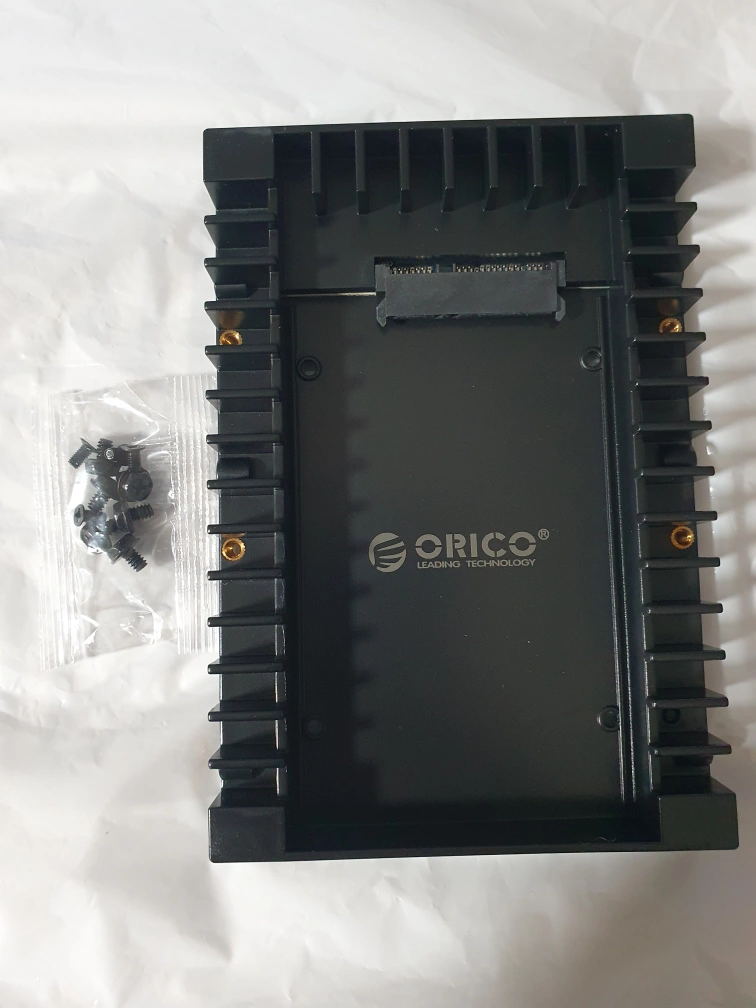 ORICO 2.5" to 3.5" hard drive/SSD adapter. Converts 2.5" drives to 3.5". Includes mounting screws. Black plastic construction. Compatible with 7-12.5mm 2.5" hard drives.