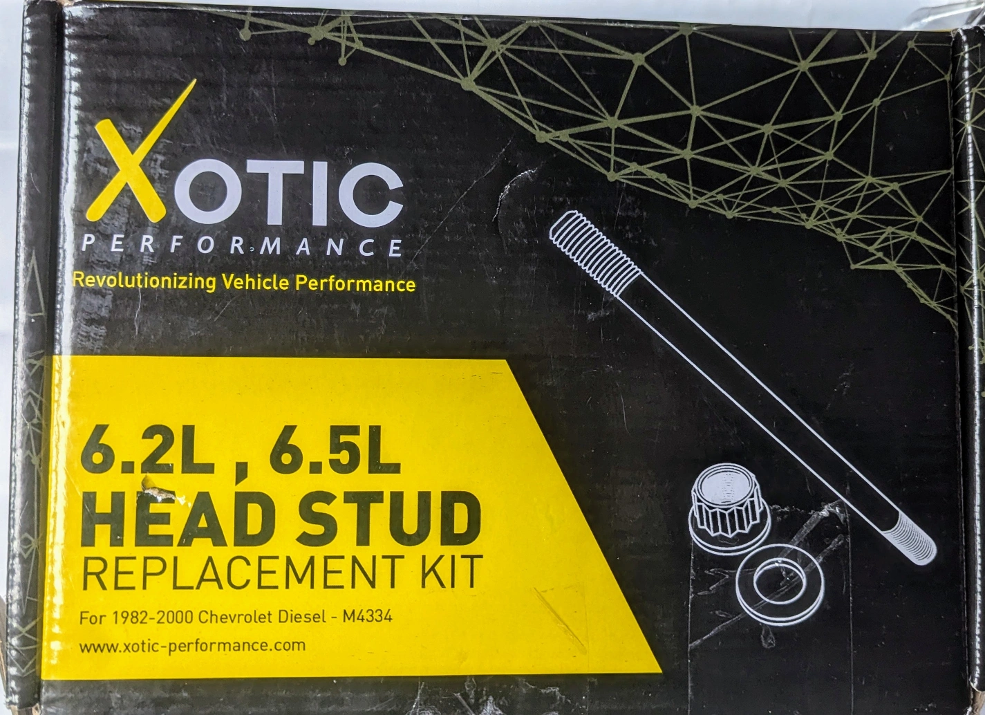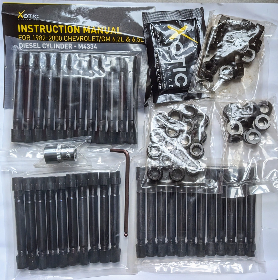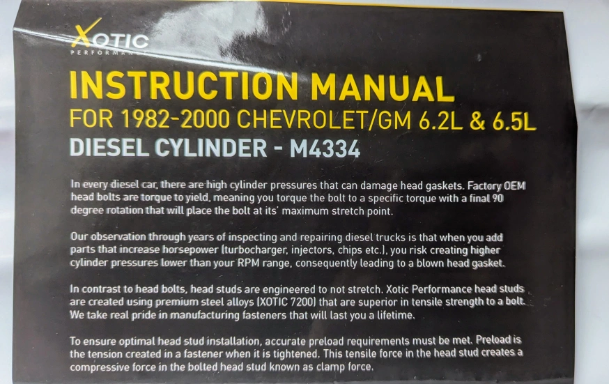 New, unused Xotic Performance head stud replacement kit. Includes all studs, nuts, and washers. For 1982-2000 Chevrolet/GM 6.2L & 6.5L diesel engines. Model M4334. Instruction manual included.