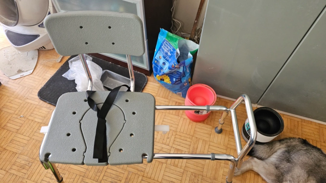 Gray shower chair with cut-out seat and adjustable legs. Heavy-duty design. Sliding transfer bench. Good condition.
