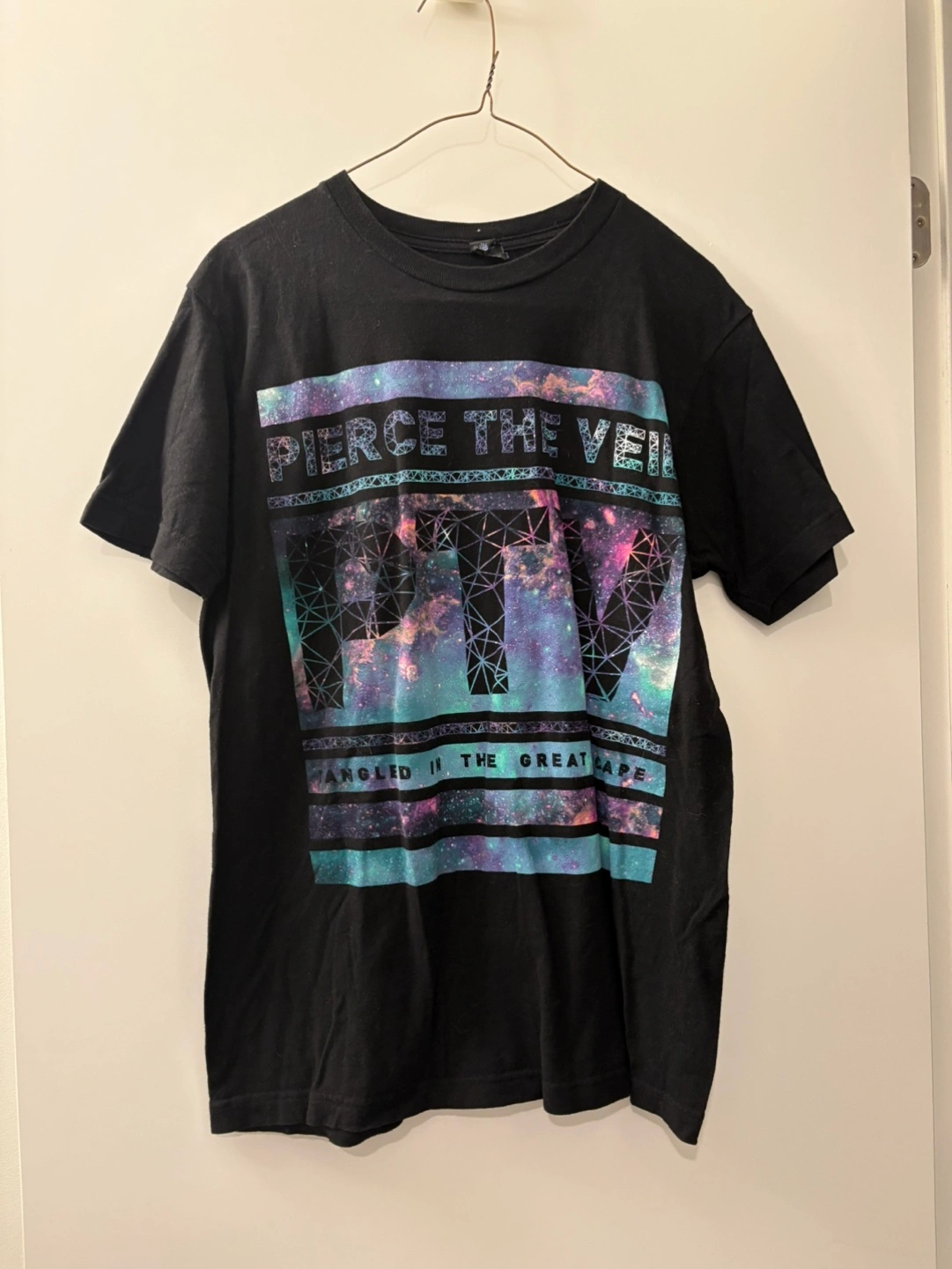 Black band t shirt for Pierce the Veil from their Tangled in the Great Escape album Features a galaxy-themed graphic with the band's logo and album title.