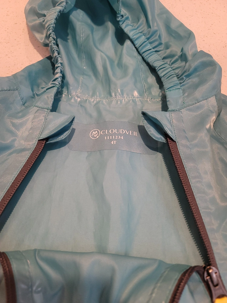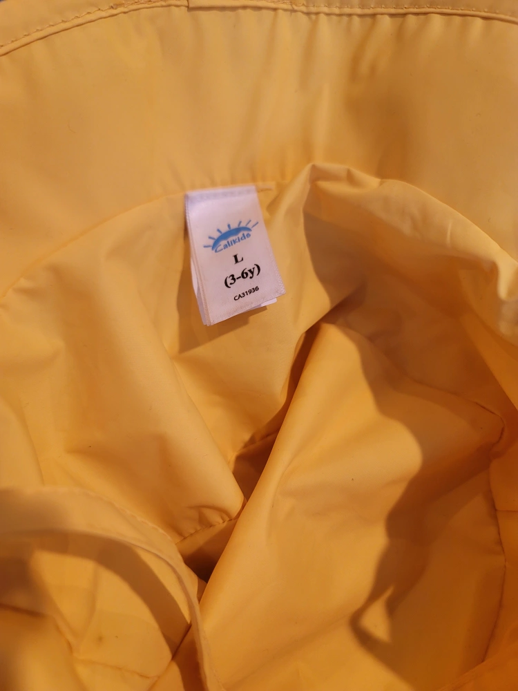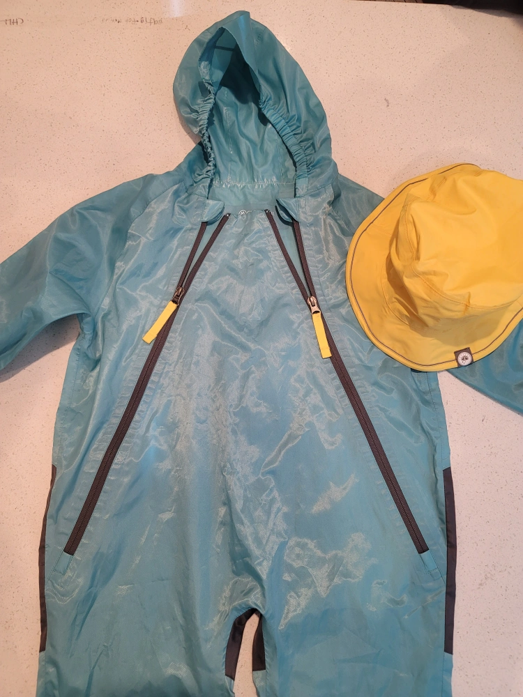 Adorable teal rain suit with waterproof yellow hat. Size 4T and L (3-6 years). Waterproof outer shell. Zipper closures.