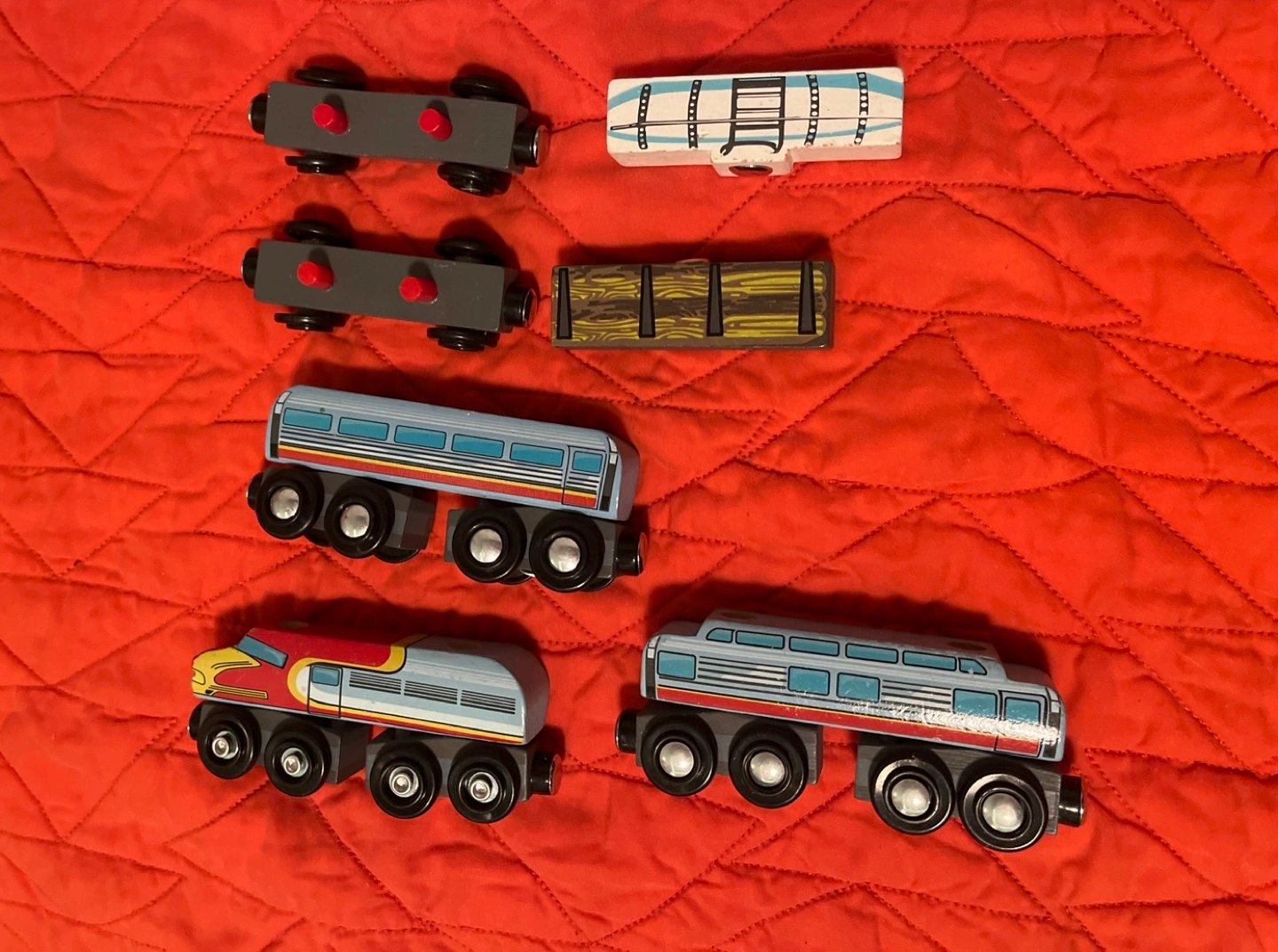 Includes 7 pieces wooden of train cars. No tracks included. Magnetic linking of cars.