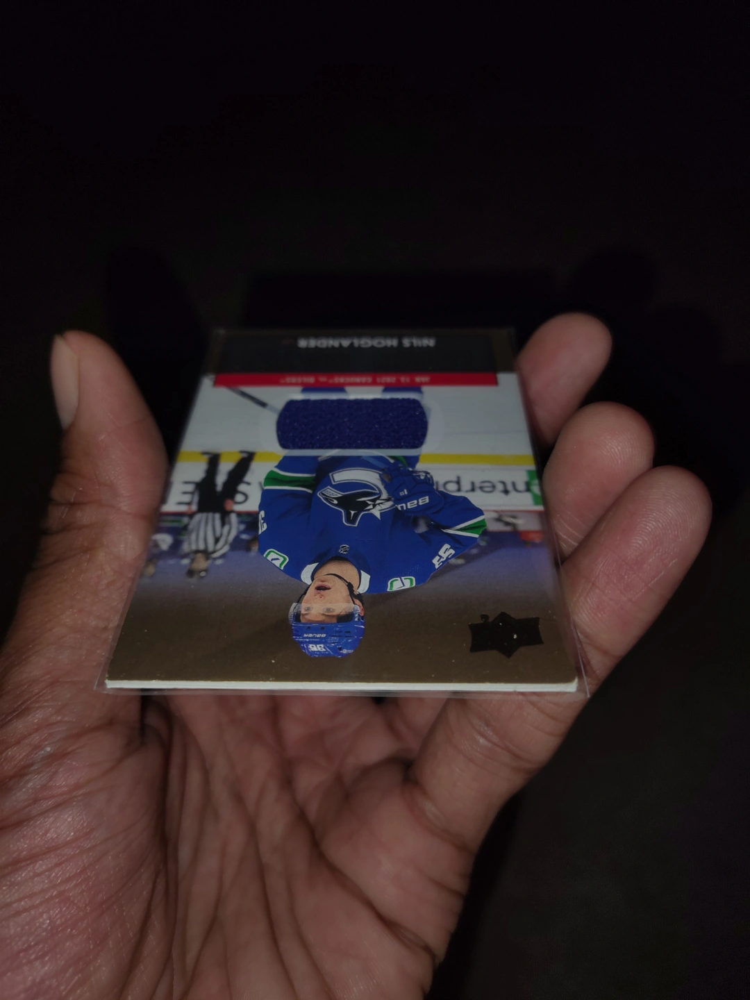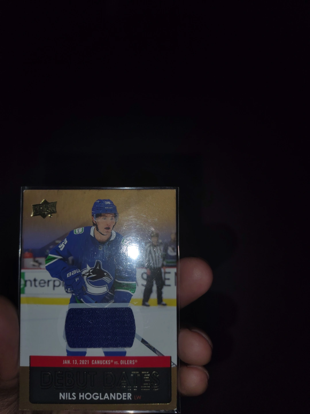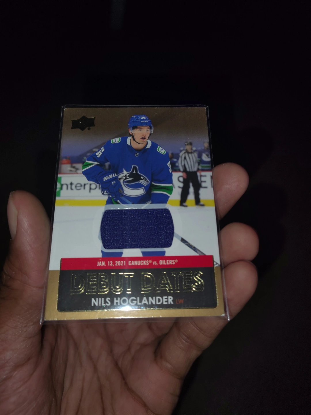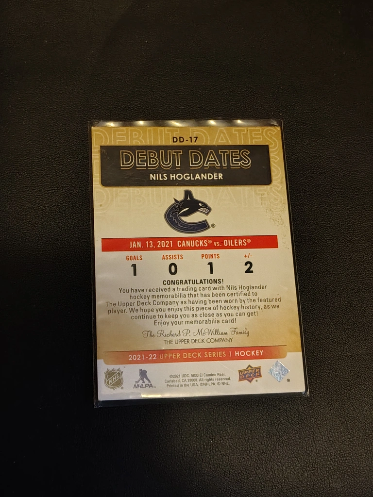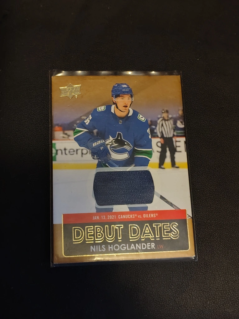 Nils Hoglander rookie card. Debut Dates insert. Features a swatch of game-worn jersey. From the 2021-22 Upper Deck Series 1 set.