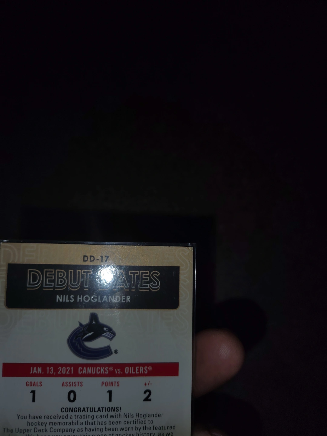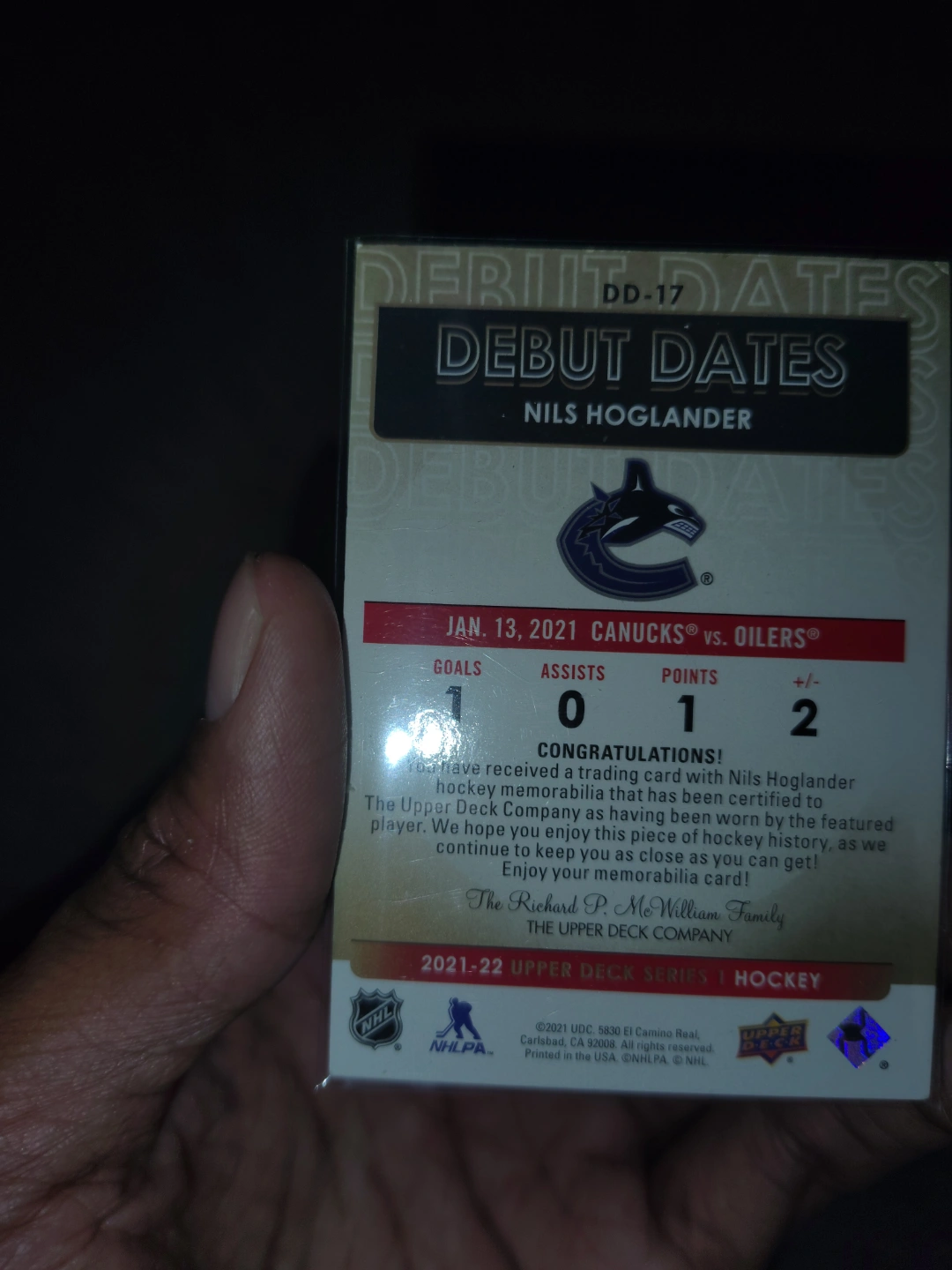 21 UD Series 1 Nils Hoglander Debut Dates Card #DD-17 Jersey
