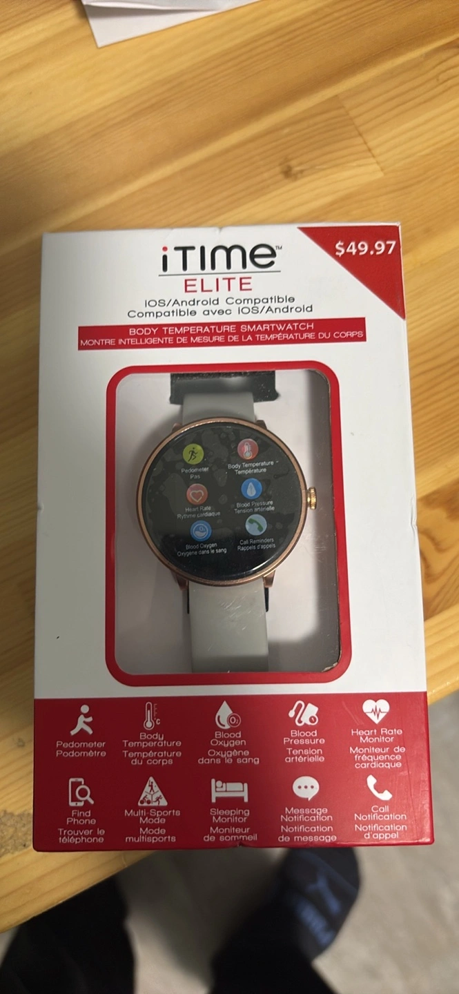 Brand new never used. Still in box. New iTime Elite smartwatch. Rose gold. Measures body temperature, blood oxygen, and blood pressure. Includes charging cable. iOS/Android compatible. Multi-sport modes. Sleep monitoring. Call and message notifications. Find phone function.