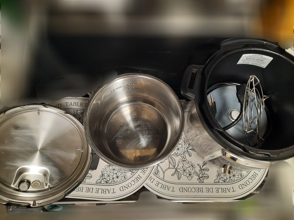 Stainless steel inner pot and lid. Multiple cooking functions. Includes steaming rack. Good condition.