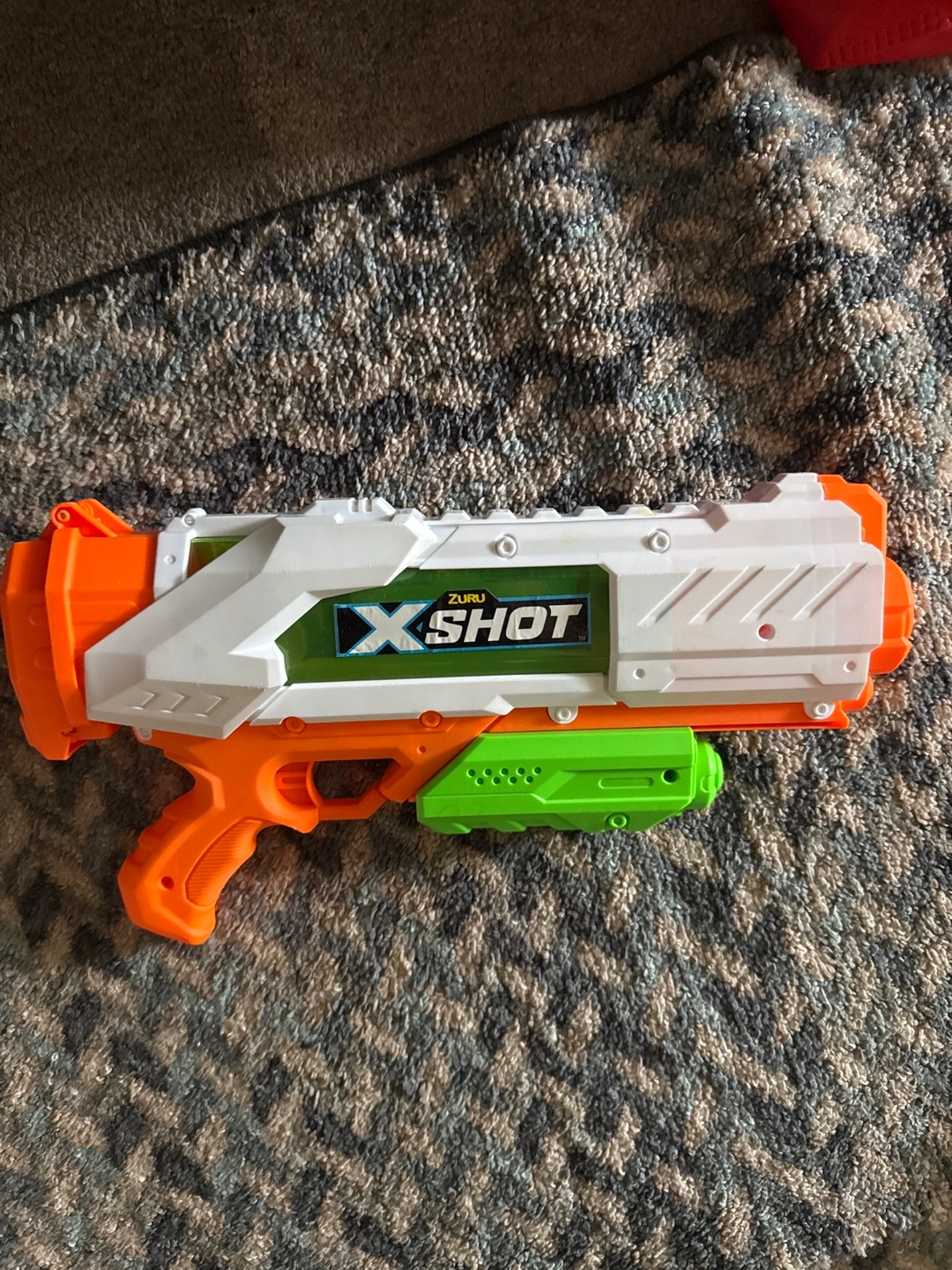 10Used Zuru X-Shot water gun. Great for summer fun. Orange, white, and green. Owned for about 4 months and still in decent condition and shoots at around the same strength.