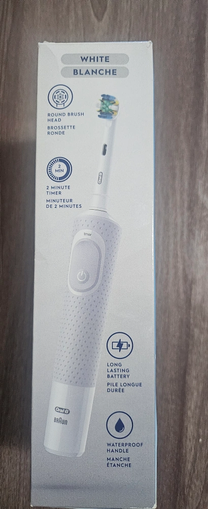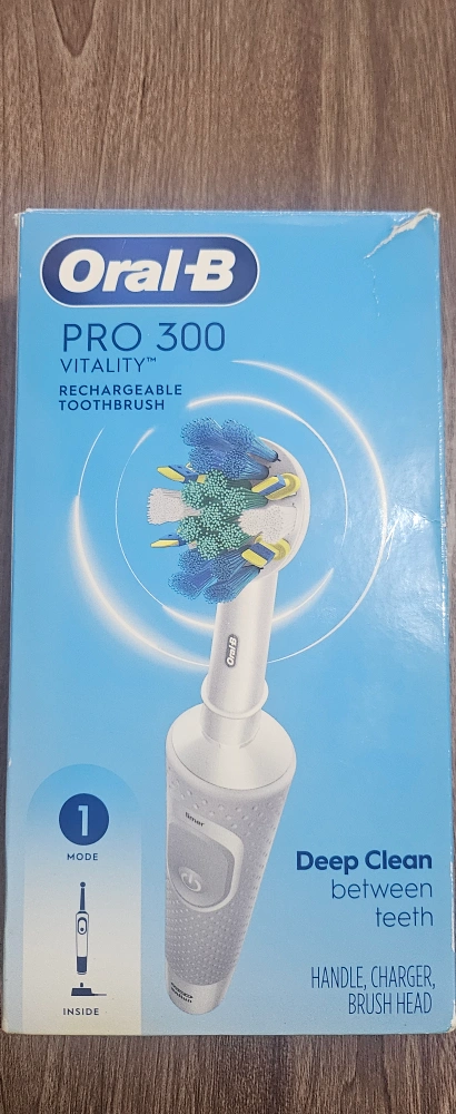New, in box. Oral-B Pro 300 Vitality rechargeable toothbrush. White. One mode. Includes handle, charger, no brush head. Two-minute timer. Long-lasting battery. Waterproof handle.