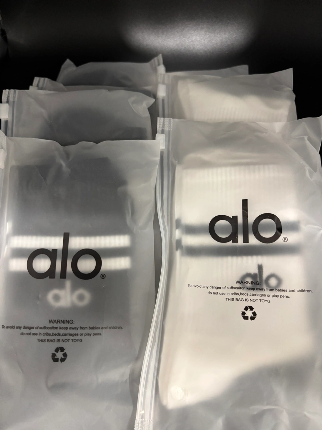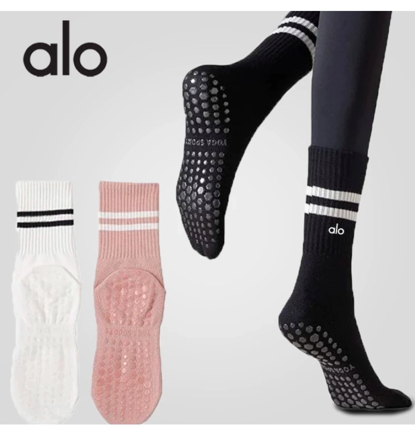 Alo Yoga grip socks. Color: black, white. Mid-calf length. Grippy bottoms. Great for yoga or other workouts.