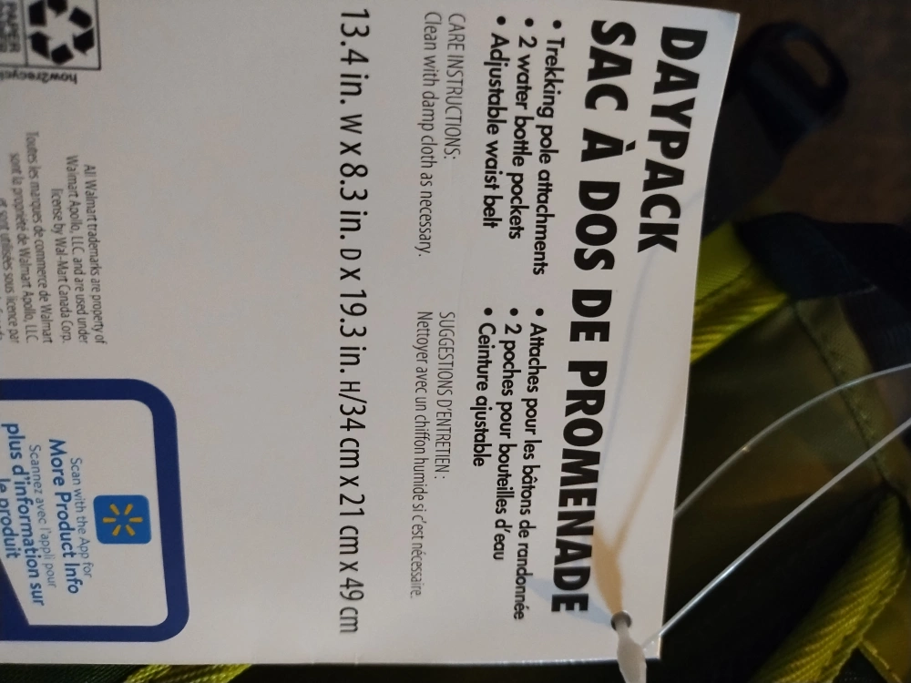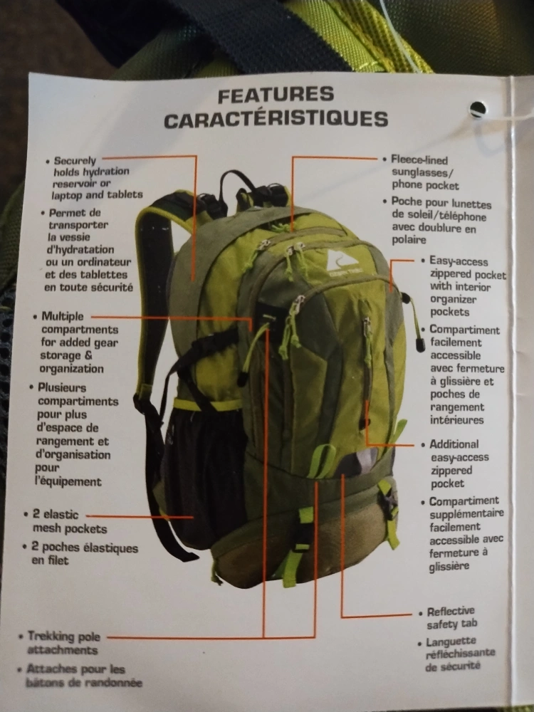 36 litre capacity daypack. Features padded back panel, adjustable straps, multiple compartments, and hydration reservoir compatible. Made from recycled materials. Green and grey.