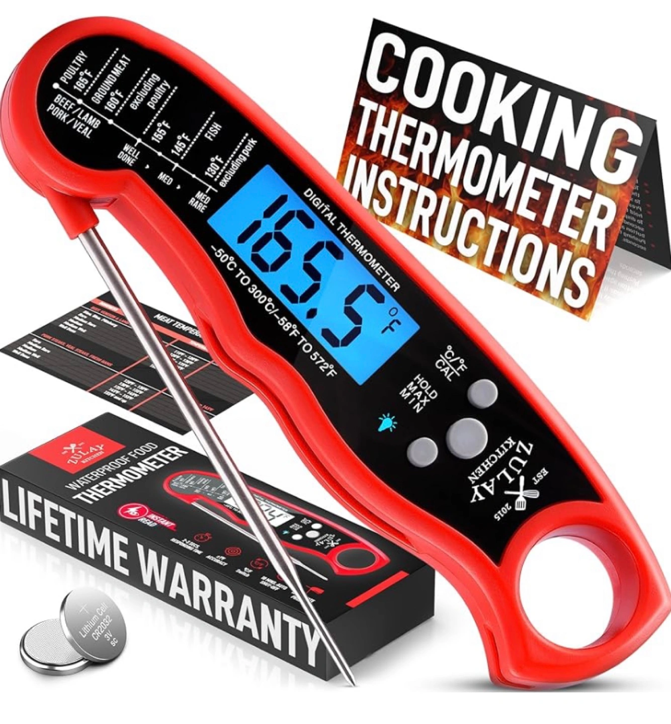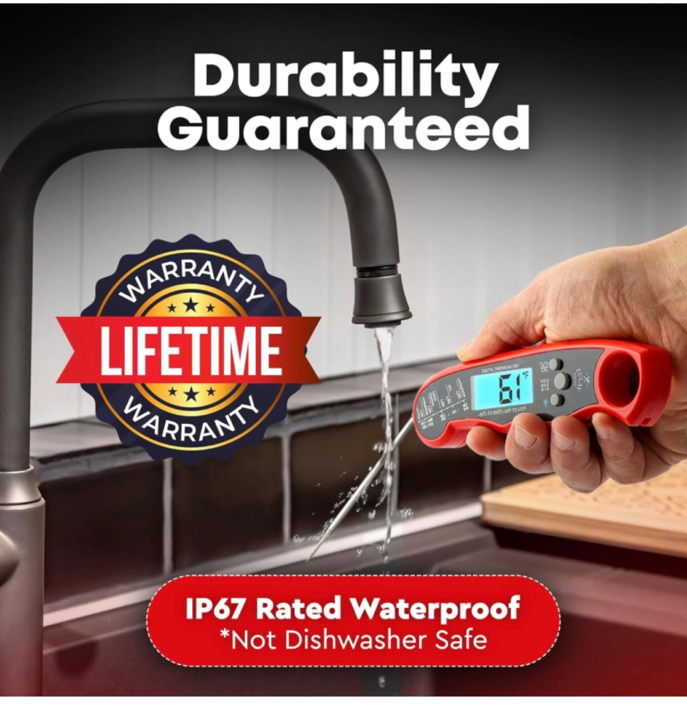 Fast and accurate digital cooking thermometer. Features a large LCD display, waterproof design, and lifetime warranty. Includes two CR2032 batteries. Measures temperatures from -50°C to 300°C / -58°F to 572°F. Probe is 180° adjustable.