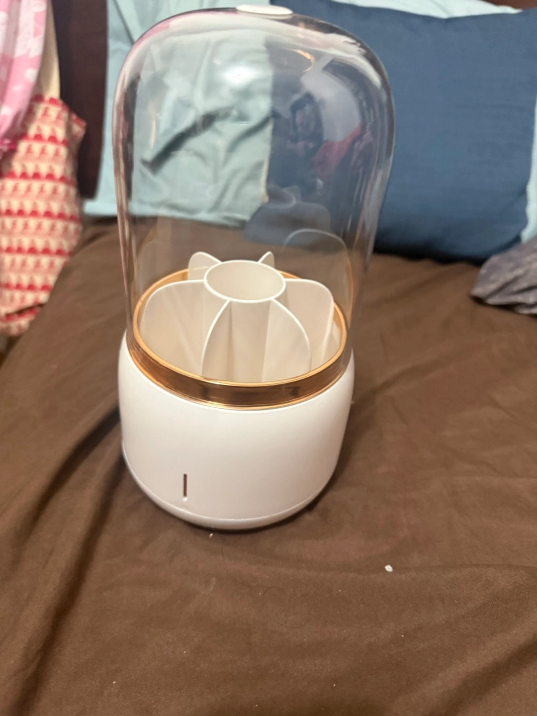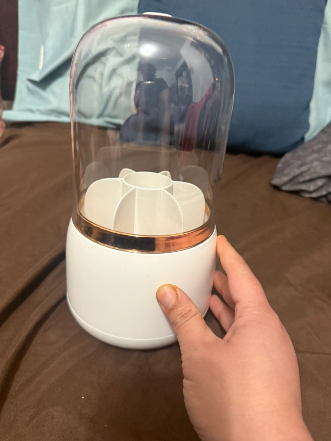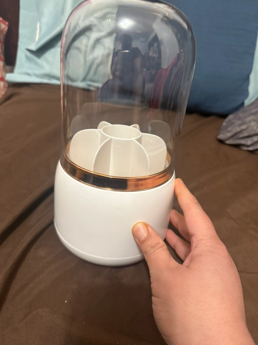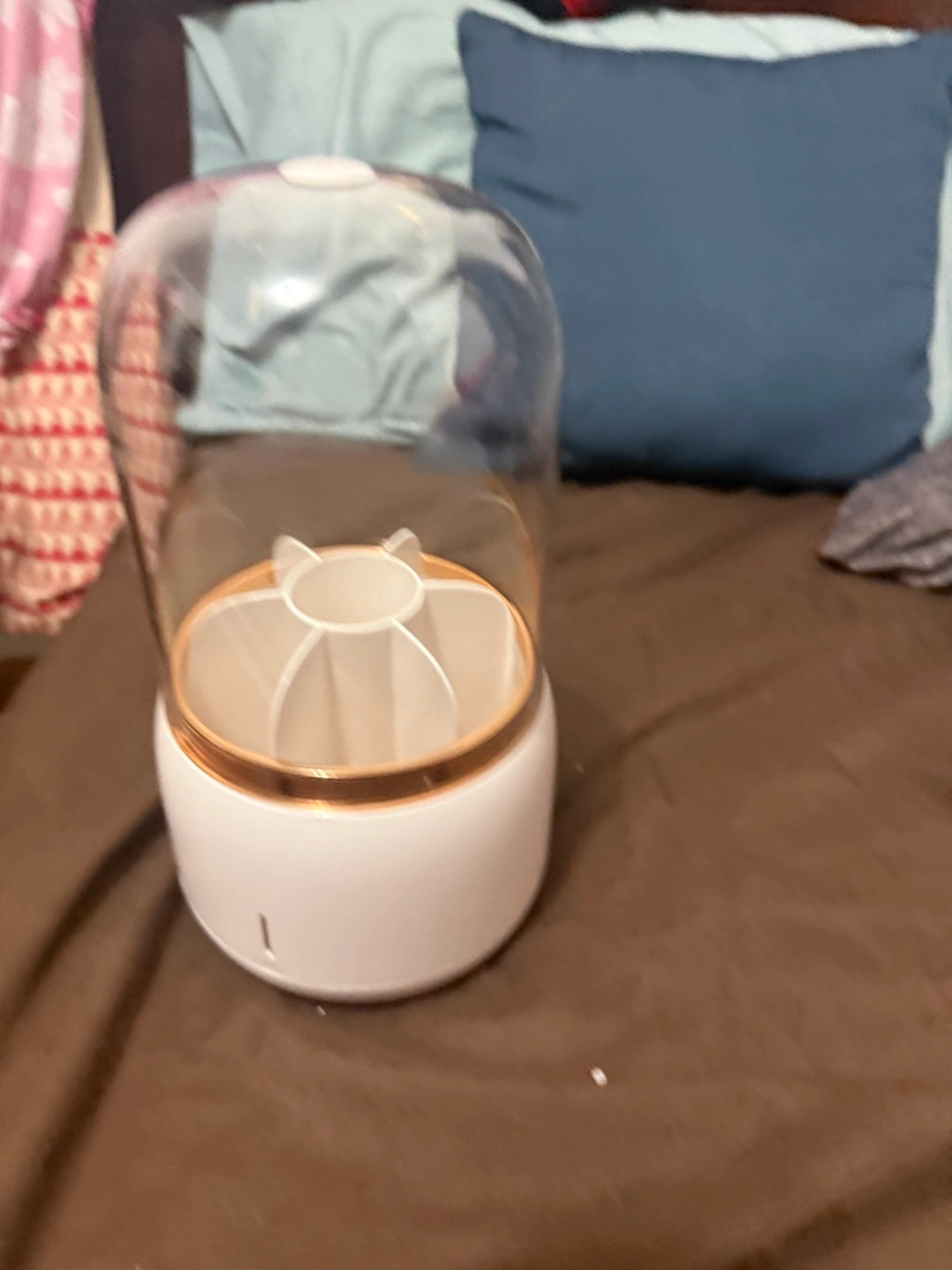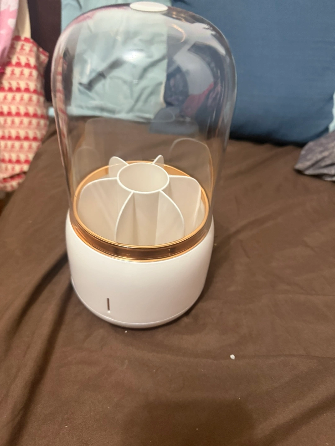 White and rose gold makeup brush holder. Clear glass cover. Holds multiple brushes. Excellent for organizing your vanity.
