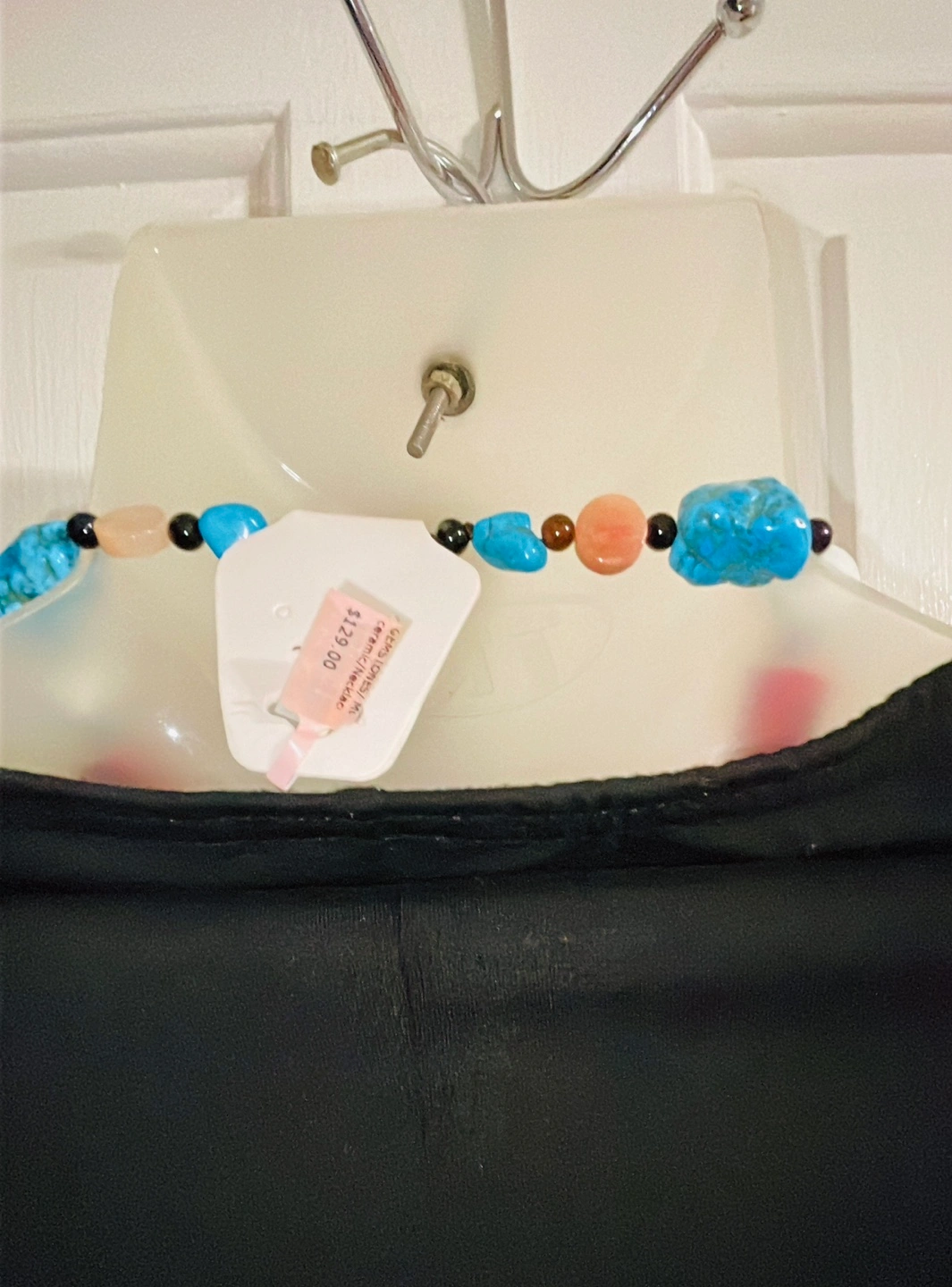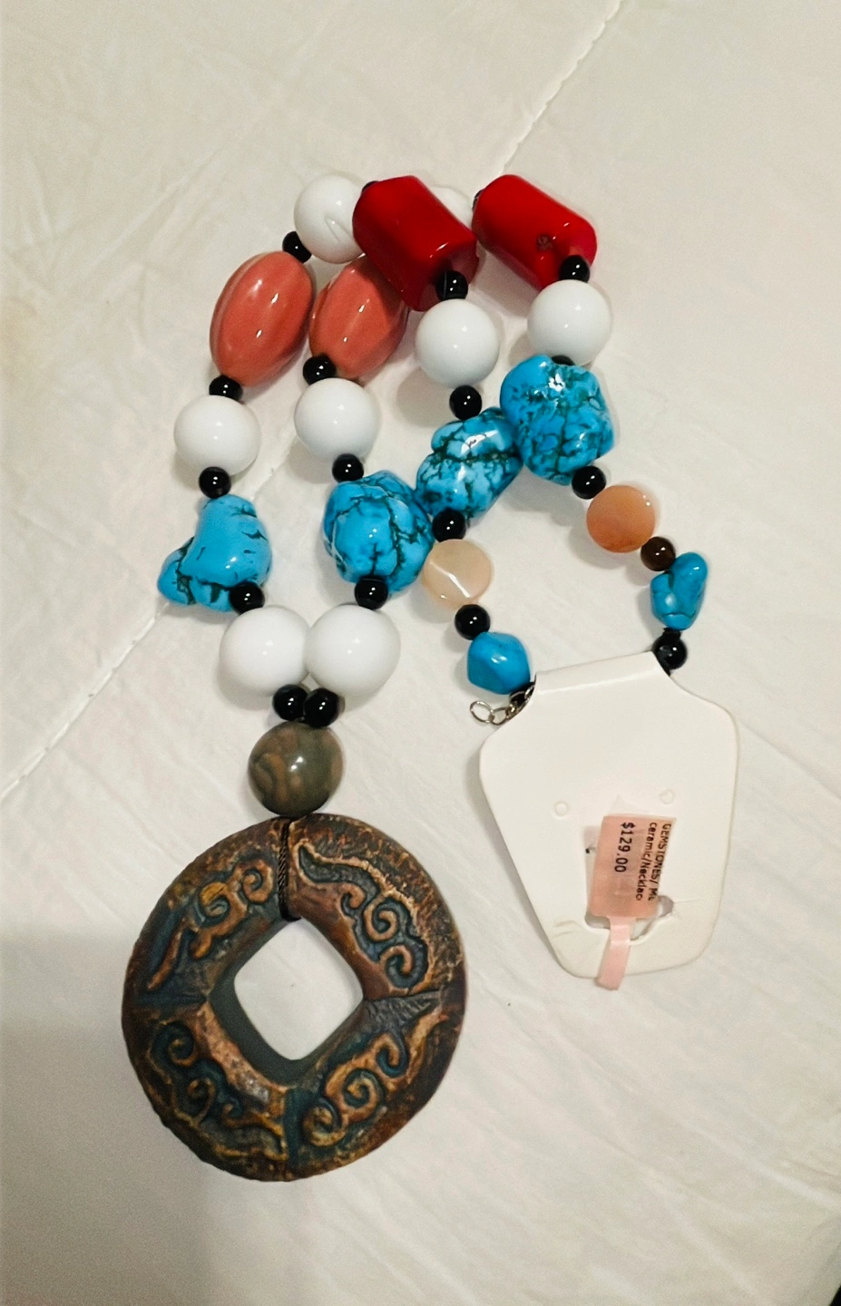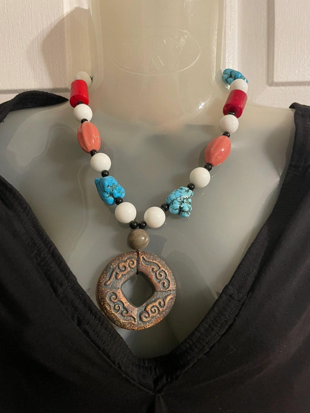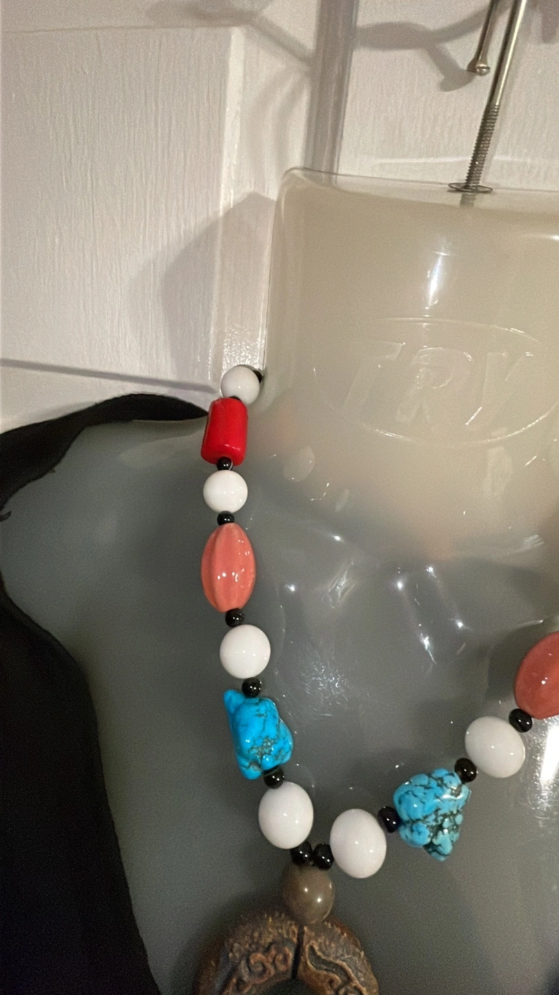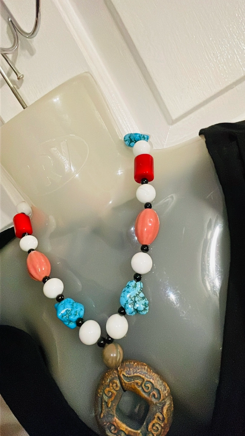 Real Corals, Onyxes, Agates & Turquoise Necklace with Pendant